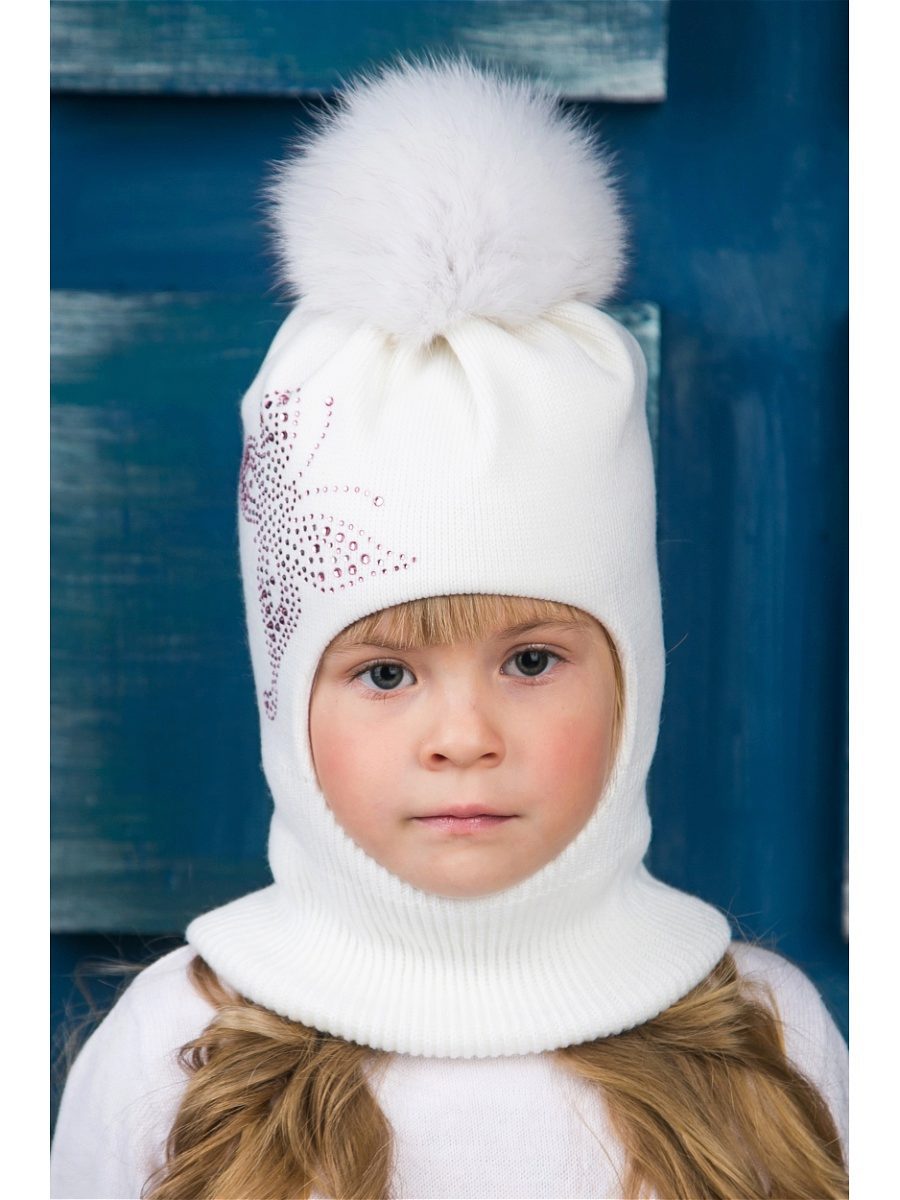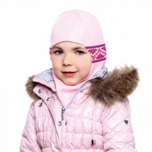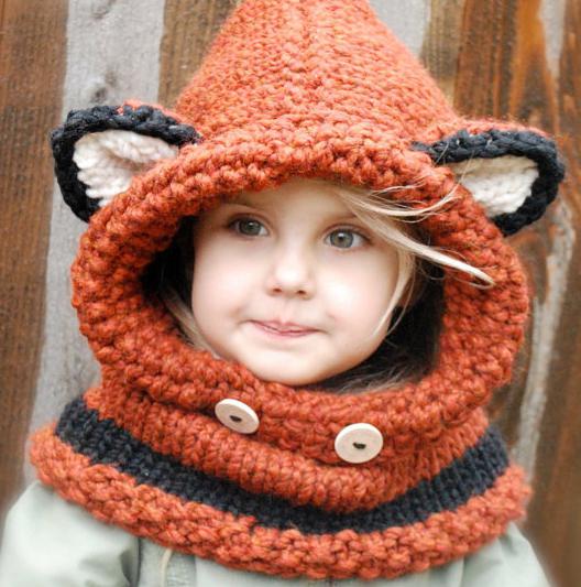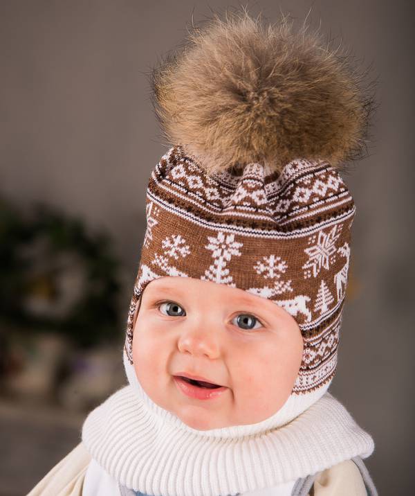 A charming variation on the theme of a hat-helmet and a scarf-snud simultaneously. Coarse-knit wool and a deep fit of the cap on the forehead will not allow the baby to freeze even in extreme cold, reliably protecting both the ears and the whole head and neck. The stylish and completely unchildish image of a little fox will add charm and mischief to the young lady.