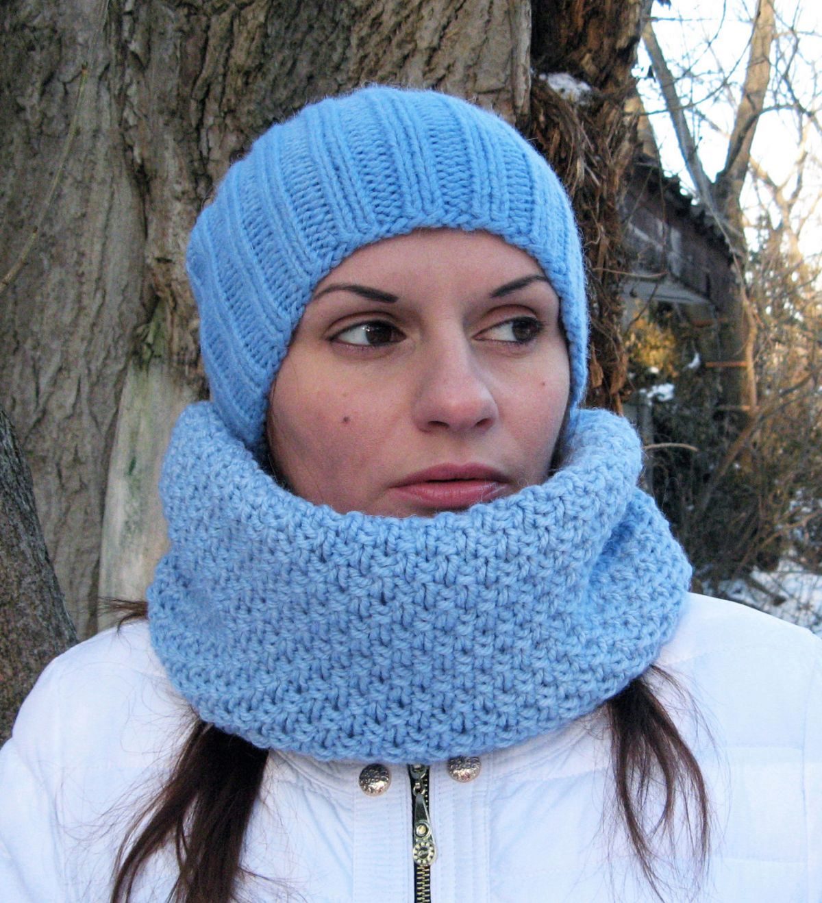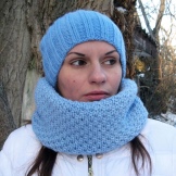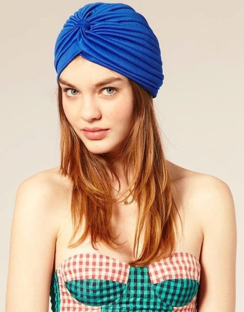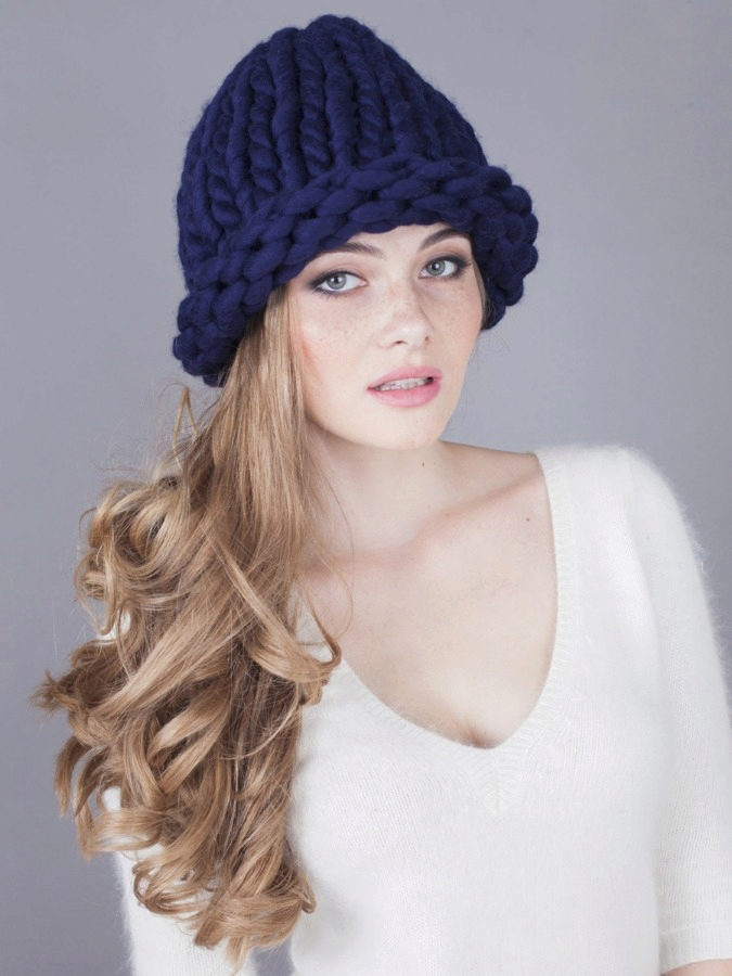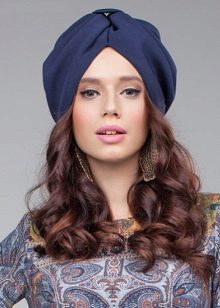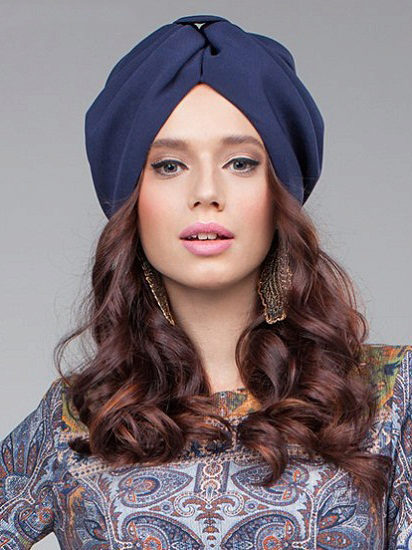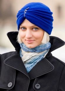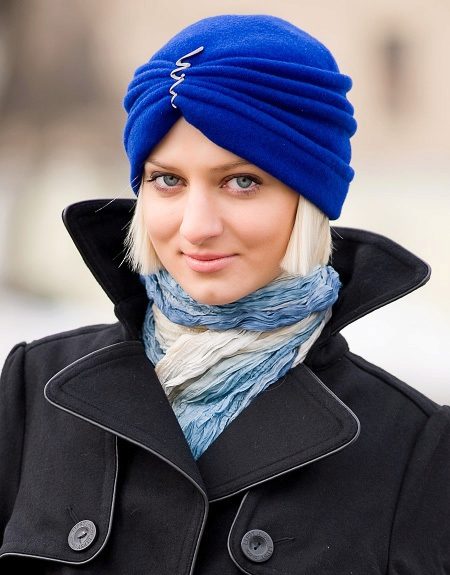 Many girls like knitted turbans. Blue models look beautiful on girls with subtle features. This hat is bright and original, so it does not require additional decorations.