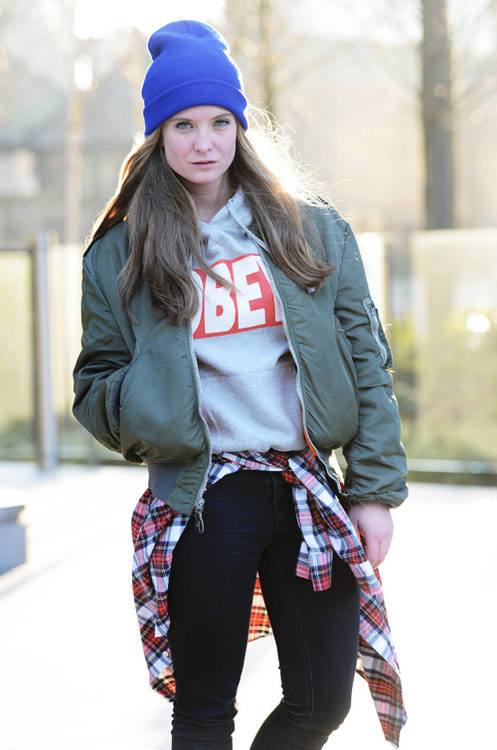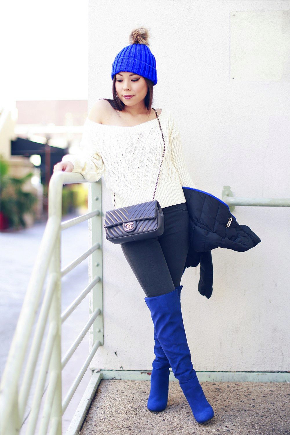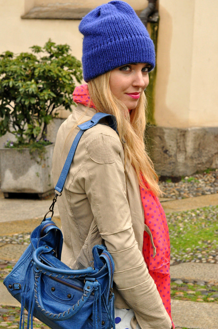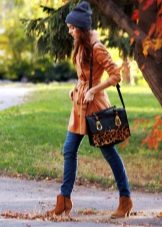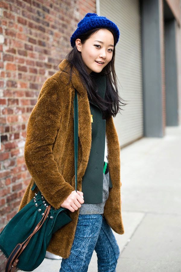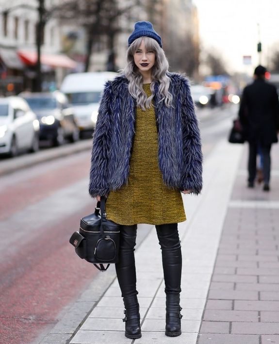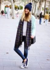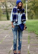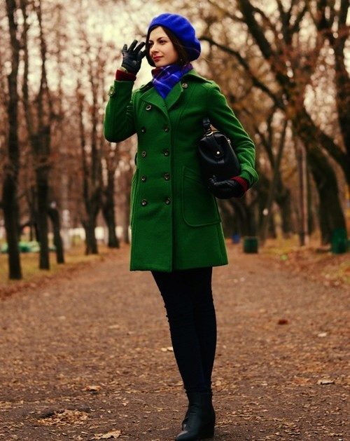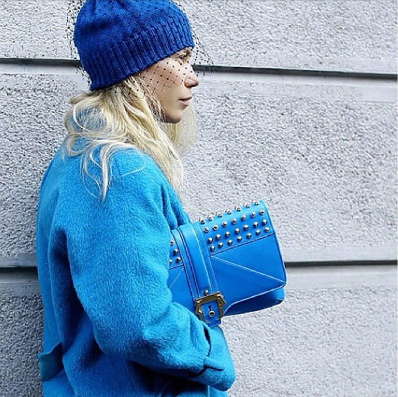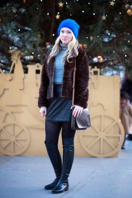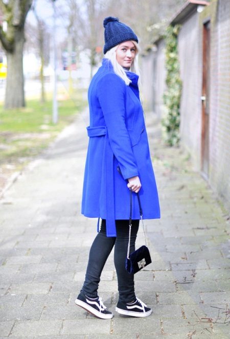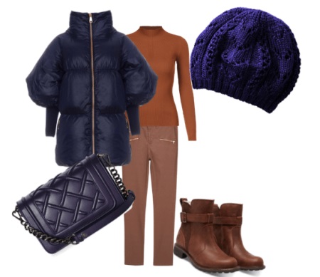 Blue color looks beautiful in combination with red and brown tones. Beautifully looks hat and down jacket in blue. When choosing shoes it is better to give preference to brown shoes, but the sweater and jeans may be darker or lighter than the color of the shoes. A clutch bag to match the cap will never be superfluous.