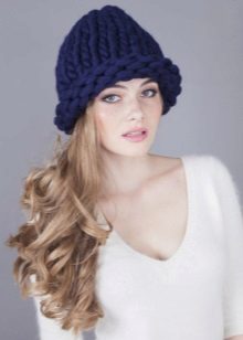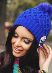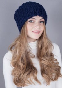 Blue hats made of thick wool yarn are very popular. Original patterns will help to give charm and creativity. It is worth paying attention to the blue hats with such exquisite patterns as "ladders", "cones" or "pigtails". This headpiece looks great in tandem with sleeps or scarves in a single color scheme.