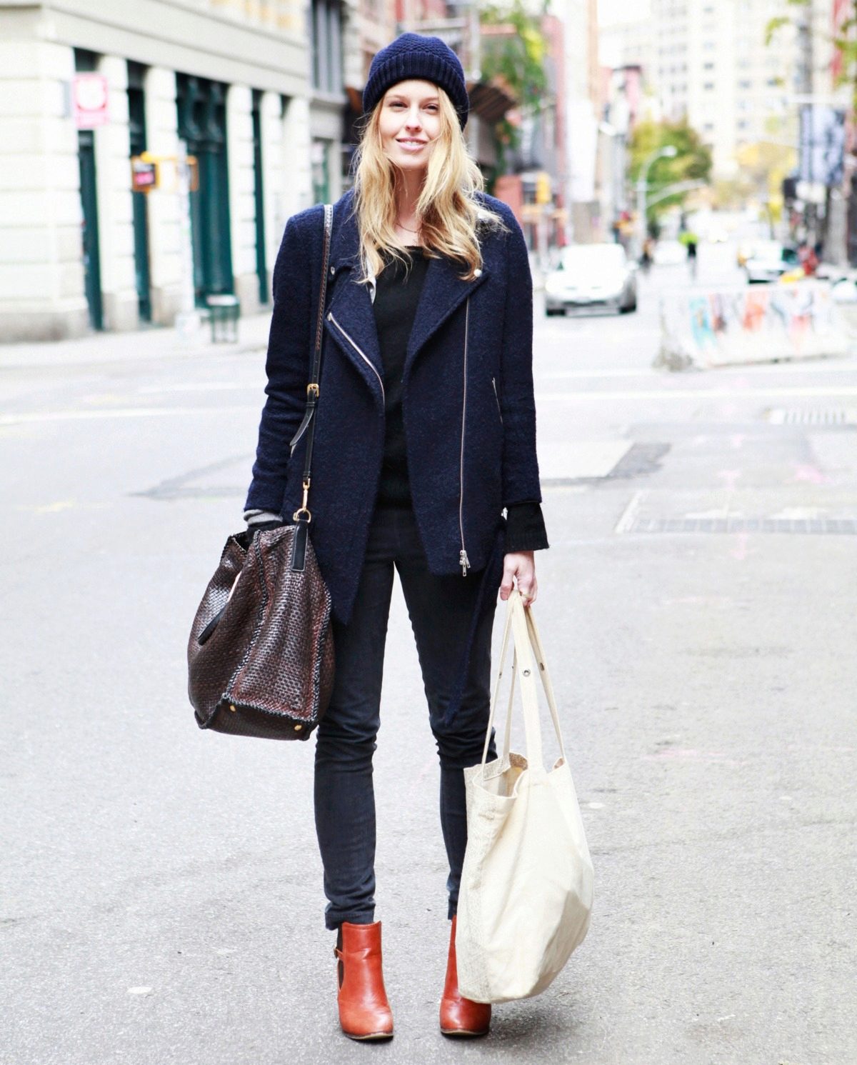 A spectacular ensemble can be created through a combination of a dark blue cap and a black leather jacket to match the headdress. You can complement the youth bow with black skinny jeans, a black long-sleeved T-shirt and red leather ankle boots.
