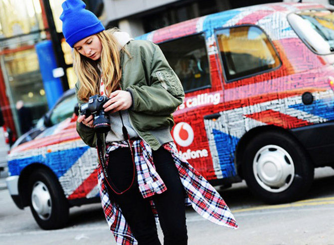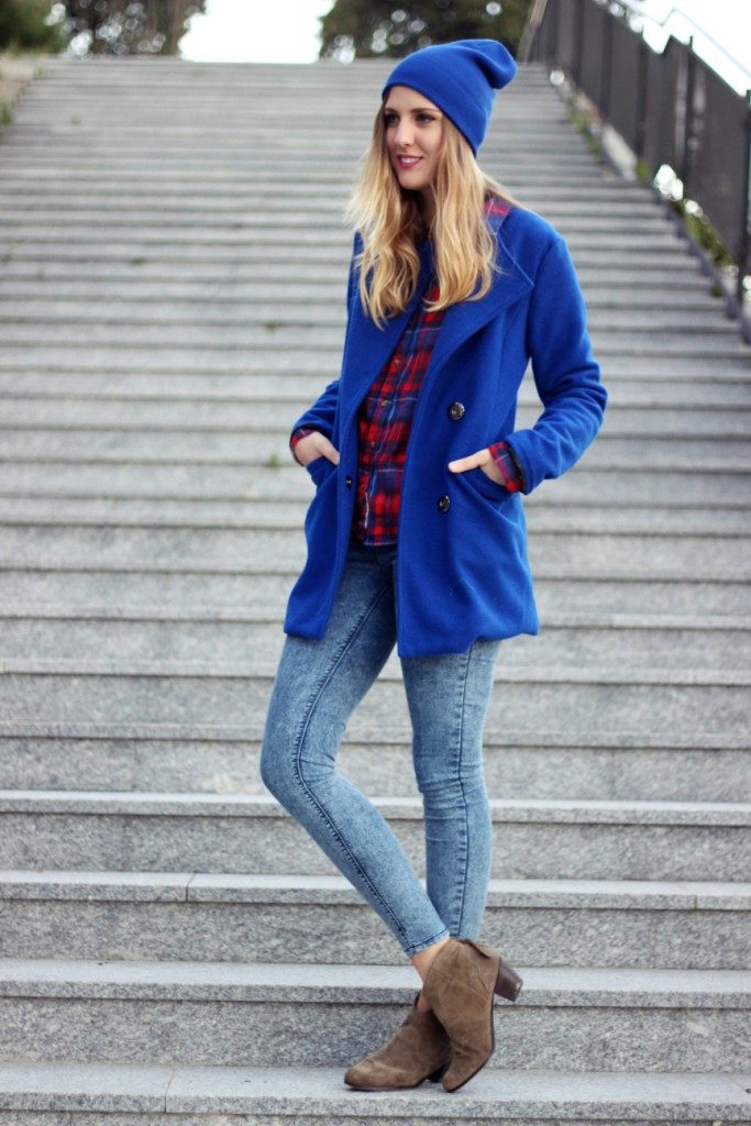 For the embodiment of a stylish bow for every day is to give preference to the cap-toe bright blue. It looks harmonious with a short coat in the same color scheme. A great complement to the irresistible casual look will be a red and blue checkered shirt, skinny jeans and suede ankle boots in a light brown color.