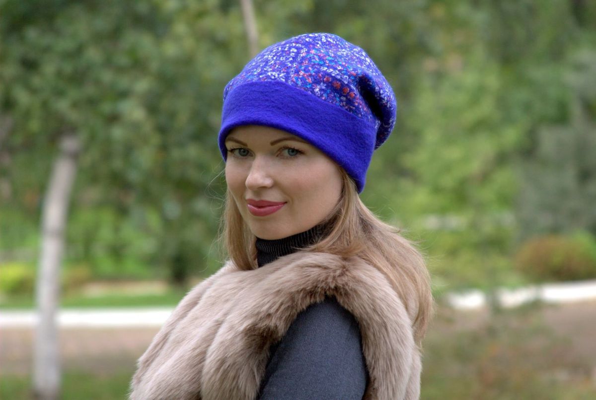 - For girls with a pale face, it is better to refuse a blue cap or be sure to add brightness to the face with makeup. Blondes are ideally suited for a bright blue headdress.