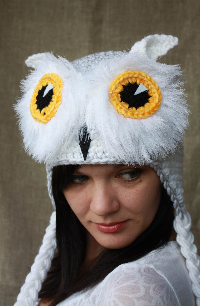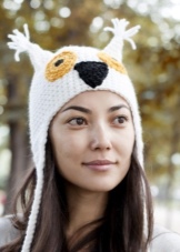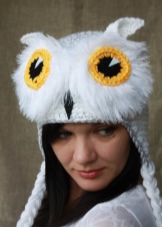 - The white hat of the owl will give the look tenderness, tranquility. This option is suitable for the winter period. The contrasting eyes of the owl do not allow the product to merge with the surrounding snowy nature. The bow forms the New Year's atmosphere, so the owner of the cap will always experience fabulous feelings that were only in childhood.