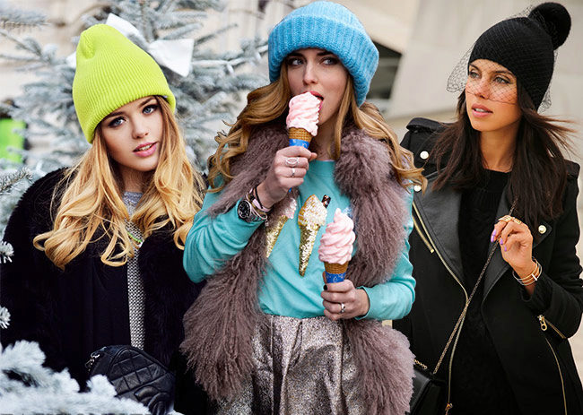 - Color type of appearance, growth and length of hair. When purchasing a hat (or material for its manufacture), pay attention to your own color type. It happens that the shape of the cap, and her style perfectly fit the girl, but when you put on it creates the effect of "loss of face" or as it is called, "you merge." This is especially true of fur hats, selected in the same tone with hair and fur coat. Brunettes fit white, purple, red colors. Blondes - the whole pastel range, but you can experiment with more intense tones. The classic black color of the cap can be quite insidious - such a hue requires an immaculate complexion; it can brighten even brighter all the flaws (uneven skin, ugly complexion, bruises or bags under the eyes).