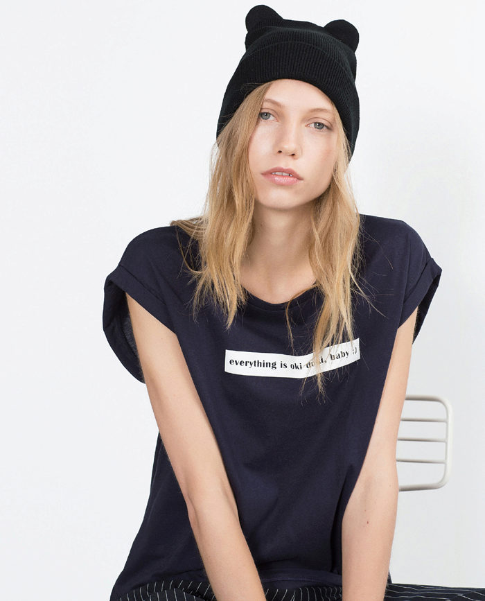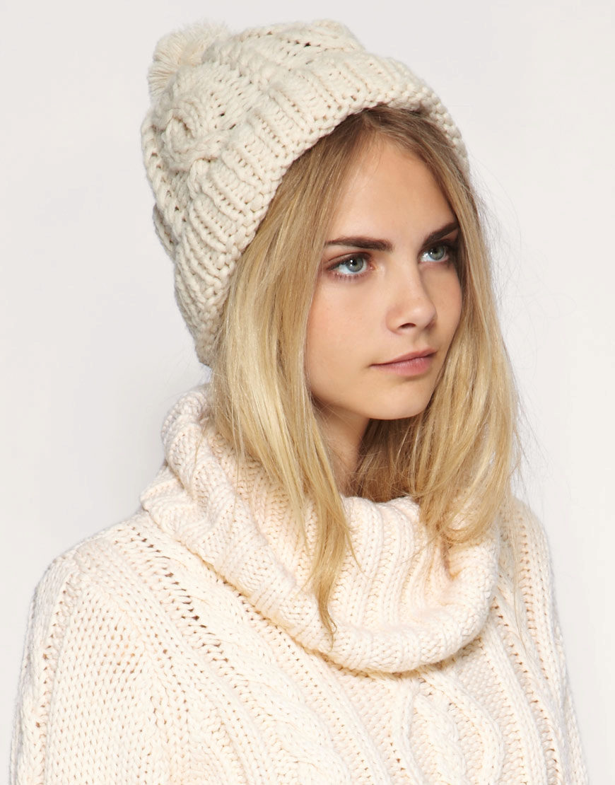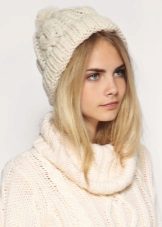 In the collection of the brand Zara there are several beautiful models of knitted hats, decorated with knitted braids, fluffy fur pompon and a small lapel, giving the cap a touch of mystery.