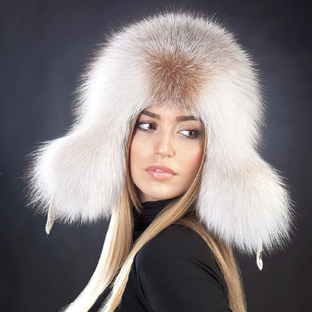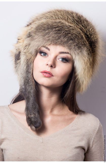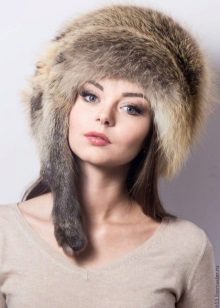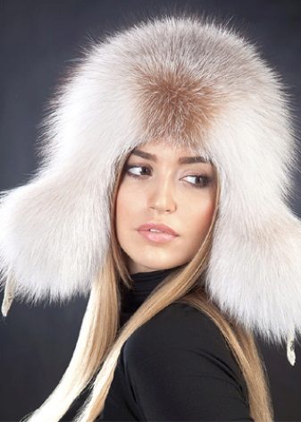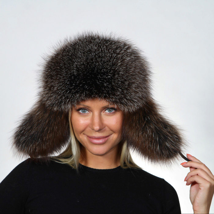 - The cap - earflap of a fox with a dark brown color of fur and a white tint of some hairs has ties that allow you to fasten the ears in the back or tie a cap in the chin area.