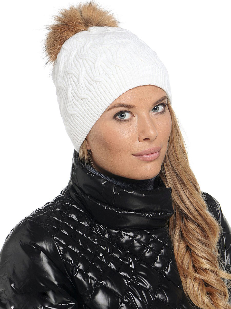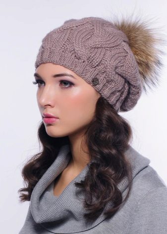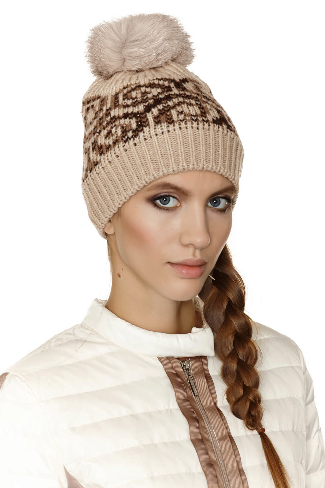 - The beige cap of half-woolen mink yarn is decorated with a fluffy pompon and has longitudinal fur stripes.