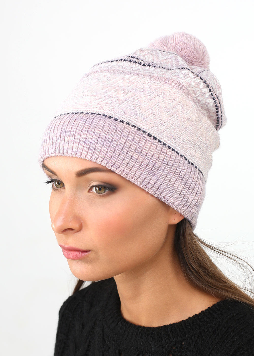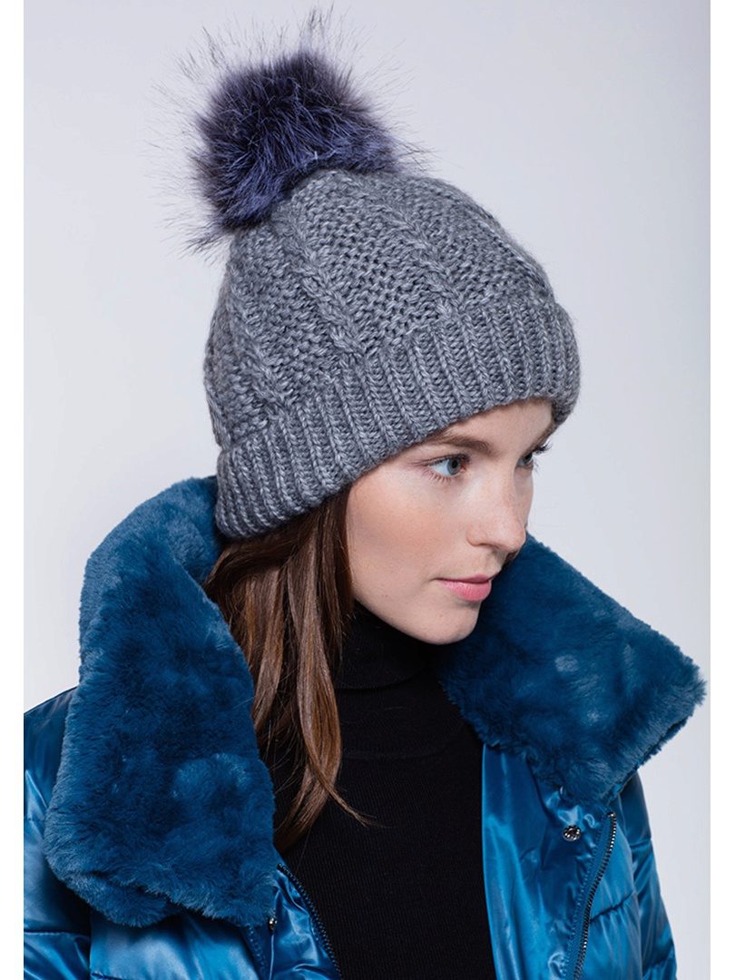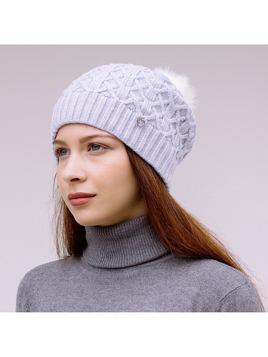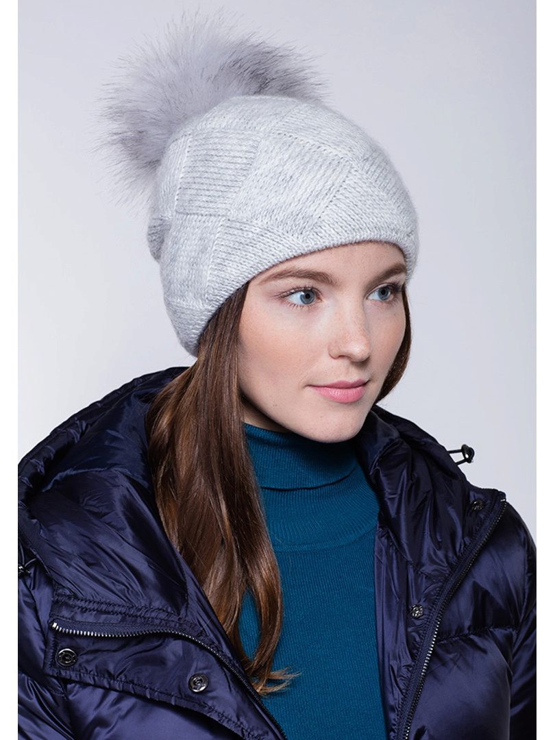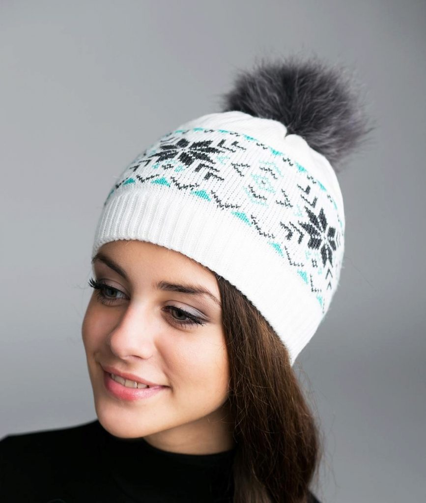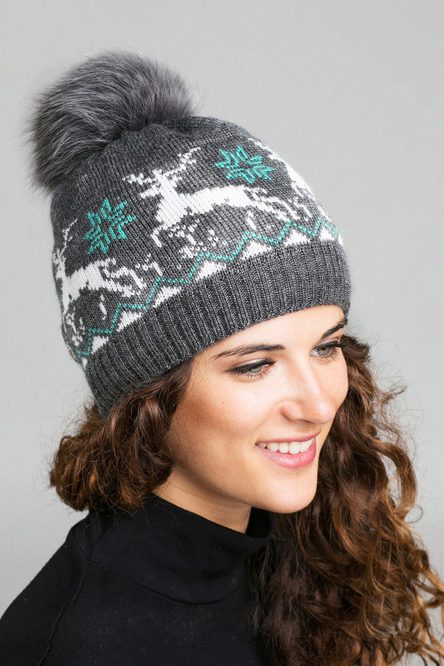 - The gray knitted hat with a print in the form of colored rhombuses has a classic style and a decorative element in the form of a silver fox pompon.