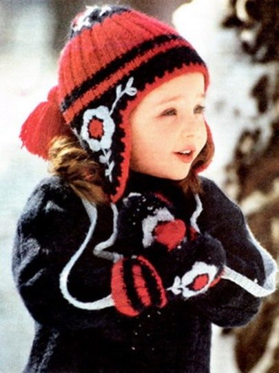 Hand-knitted hat-cap draws attention to the bright color combination of red, black and white colors. The highlight of this model is the decoration of a large floral pattern on the ears, crown. Ears of hats can be worn freely on warm winter days, in bad weather it is convenient to quickly tie them under the chin. On the top, a striking voluptuous pom-pom of bright color on a long thread. In addition to the hat go mittens, fastened together for comfortable wearing, performed in the same manner and repeating floral pattern. This set is suitable for girls of 3 years and more, even teenagers. It is easily combined with almost any outerwear due to the classic combination of colors and the versatility of style.