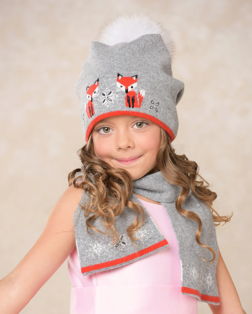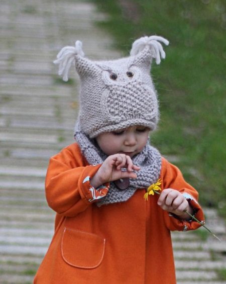 Charming knitted set of hats for girls with a scarf. The cap is made in the form of an owl - with owls ears, decor and textured knit. Such a cap fits perfectly on the head of a child, with a deep landing, which reliably protects against blowing and precipitation. Gray "owl" color additionally gives the effect of similarity with the image. The soft rounded elastic on the forehead allows not to overly tighten and tighten the cap. The scarf is not too long, but of sufficient length to tie it around the neck or wrap the neck. This hat is recommended for children from 1 to 7 years old with fur coats, bright coats, jackets of rich colors.