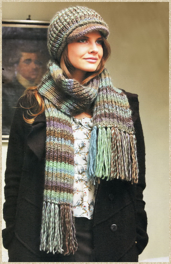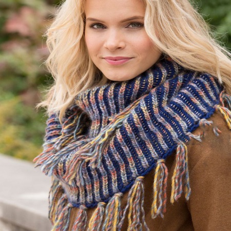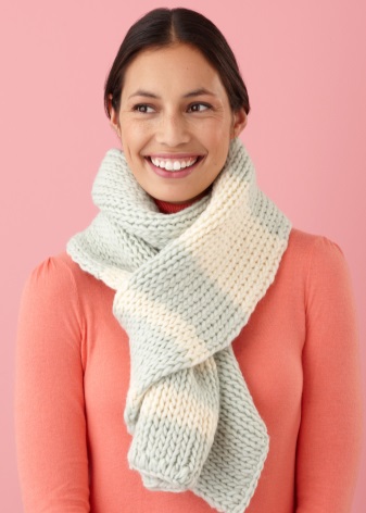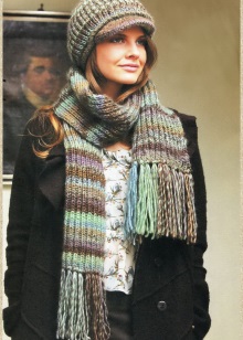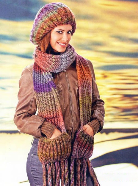 The accessory made of multi-colored yarn, which is cast in different tones, looks very impressive. This feature of the threads allows you to create patterns of vertical and horizontal multicolored stripes. This pattern harmoniously complements monochromatic coats, down jackets, jackets. The color of the bands usually echoes the main tone of the ensemble. Shades can be several, as a rule, it is a calm color group.