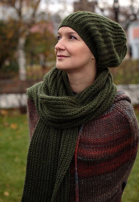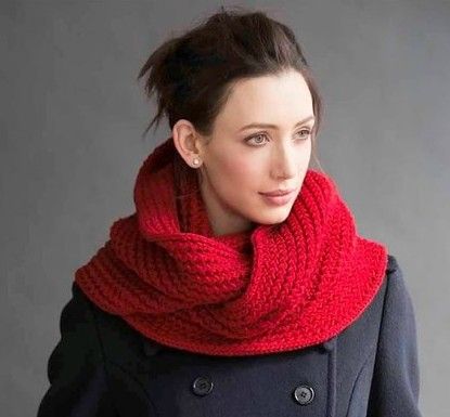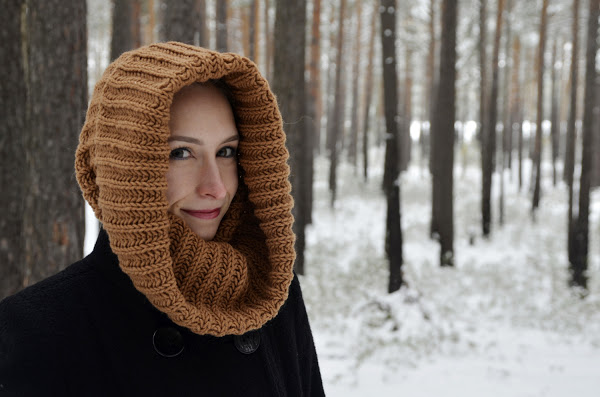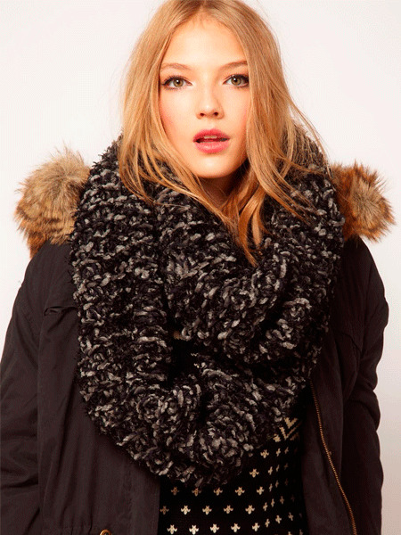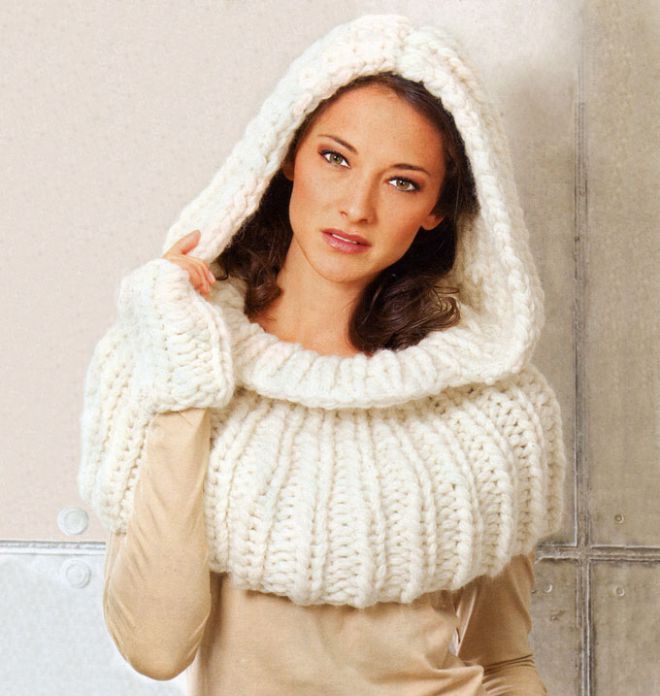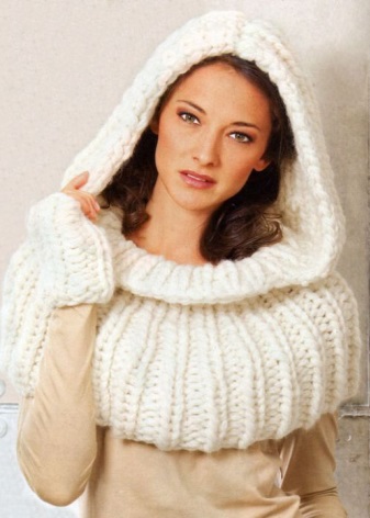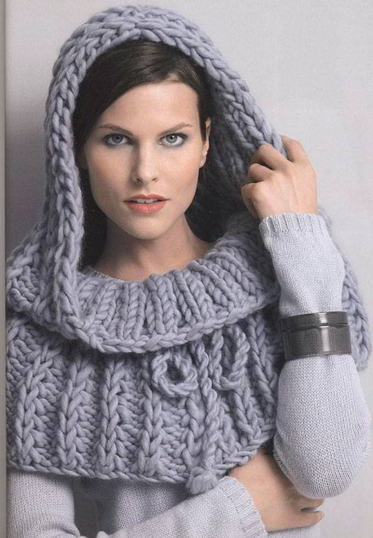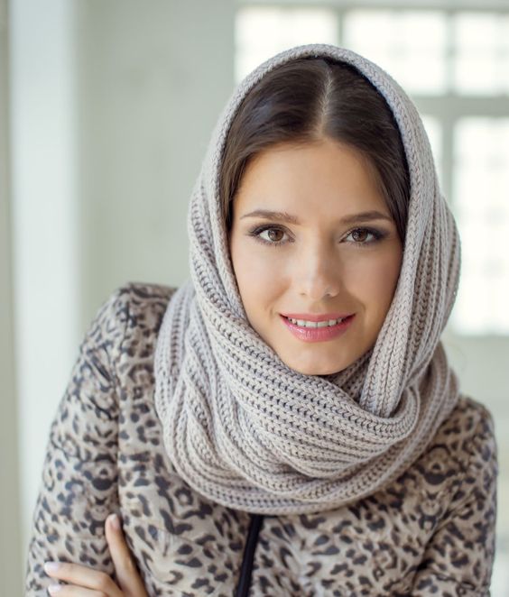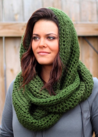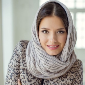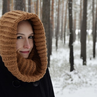 It can be of different lengths and volumes. The main way of its design is quite simple: the product is folded into a figure of eight and put on over the head. Then one of the rings is placed on the head, turning the scarf into a headpiece that warms up well from the cold. This option carefully preserves the hairstyle and protects from the wind not only the head, but also the humeral body, back and chest. With a large length of the product perform an additional turn around the neck.