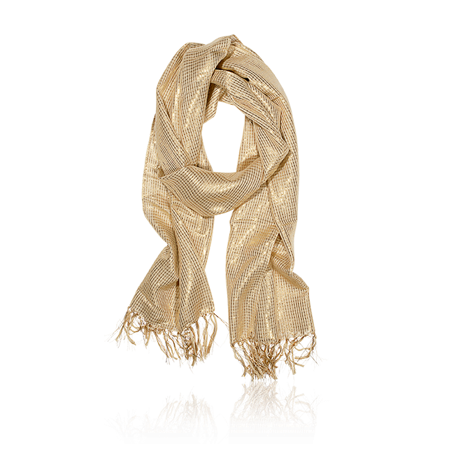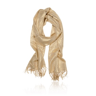 Another model Oriflame scarf with the name "Goldie" made in golden color and complemented by radiant lurex of the same shade. The product can perform the functions of shawls and scarves and will be a great addition to any image.