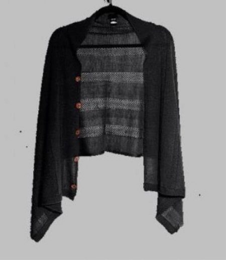 The multifunctional scarf is a simple rectangular product made of acrylic and complemented with buttons and eyelets on opposite sides. Available in black and terracotta patterns with a pattern in the form of knitted stripes of different textures. The slogan of such a scarf "One for All" is quite justified, for such a product can be worn not only as a scarf or stole, but also as a cardigan, a bolero, a cape on a dress, or a scarf.