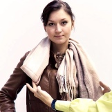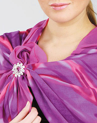 For this method, you need to bend one of the ends of the shawl across, about 20 cm. Then you need to twist this fold in a spiral into a rosette. It is possible to fix the made flower either with the fringe of the shawl itself or with a pin. In the next step, you must wear a shawl, securing the flower at the shoulder. The second end can be beautifully laid on the second shoulder or left free.