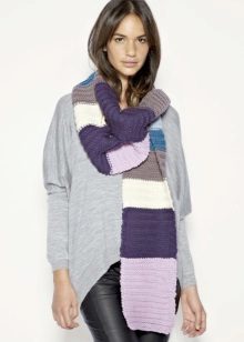 This model is a knitted scarf in the form of a triangle. Unusual because it is very long. This accessory is similar to a scarf and shawl. You can simply put it on your shoulders or wrap it around your neck.