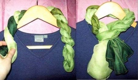This method requires wearing a scarf around the neck, leaving the ends loosely hanging on the chest. The next stage proposes to twist the ends between themselves a couple of times, take them behind their backs and disguise them as a scarf base. At the end you want to straighten the scarf.
