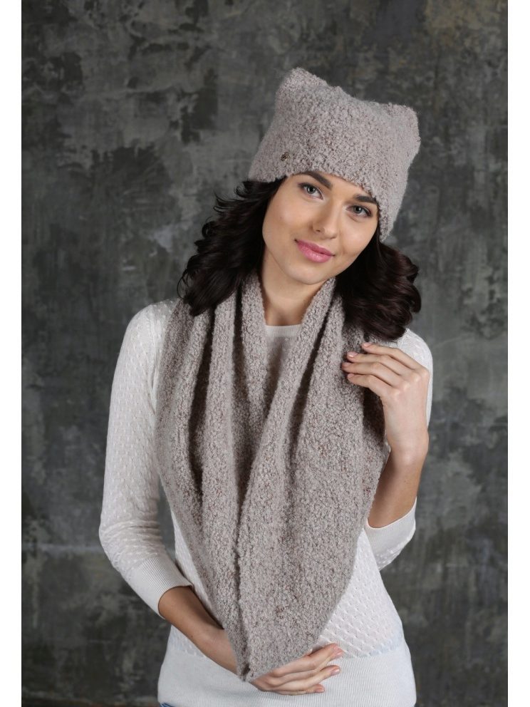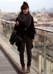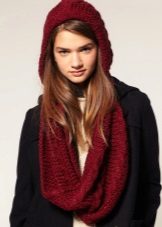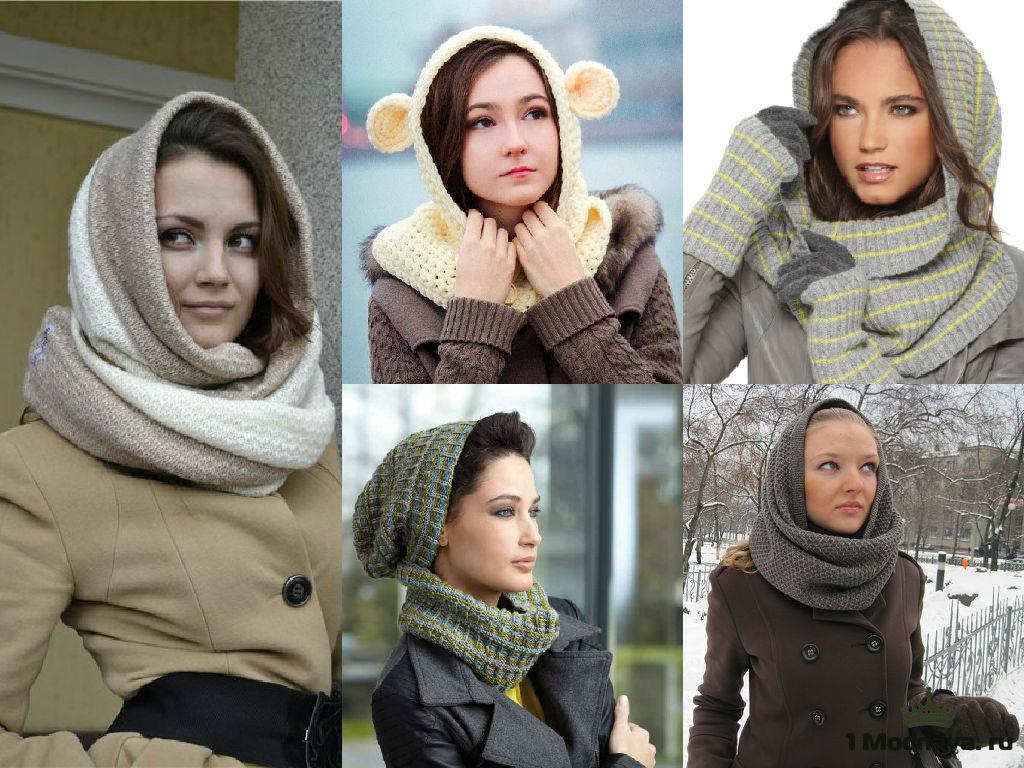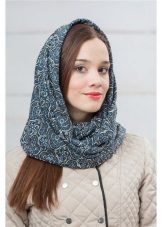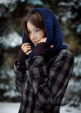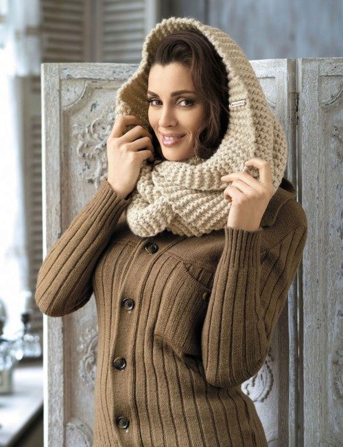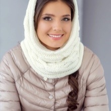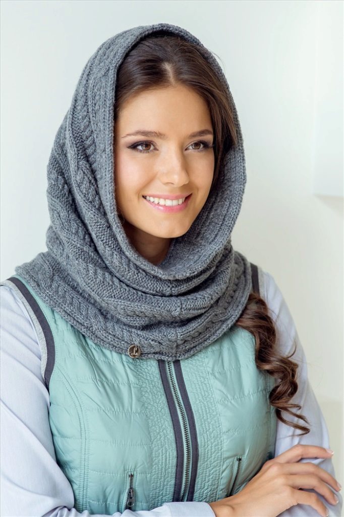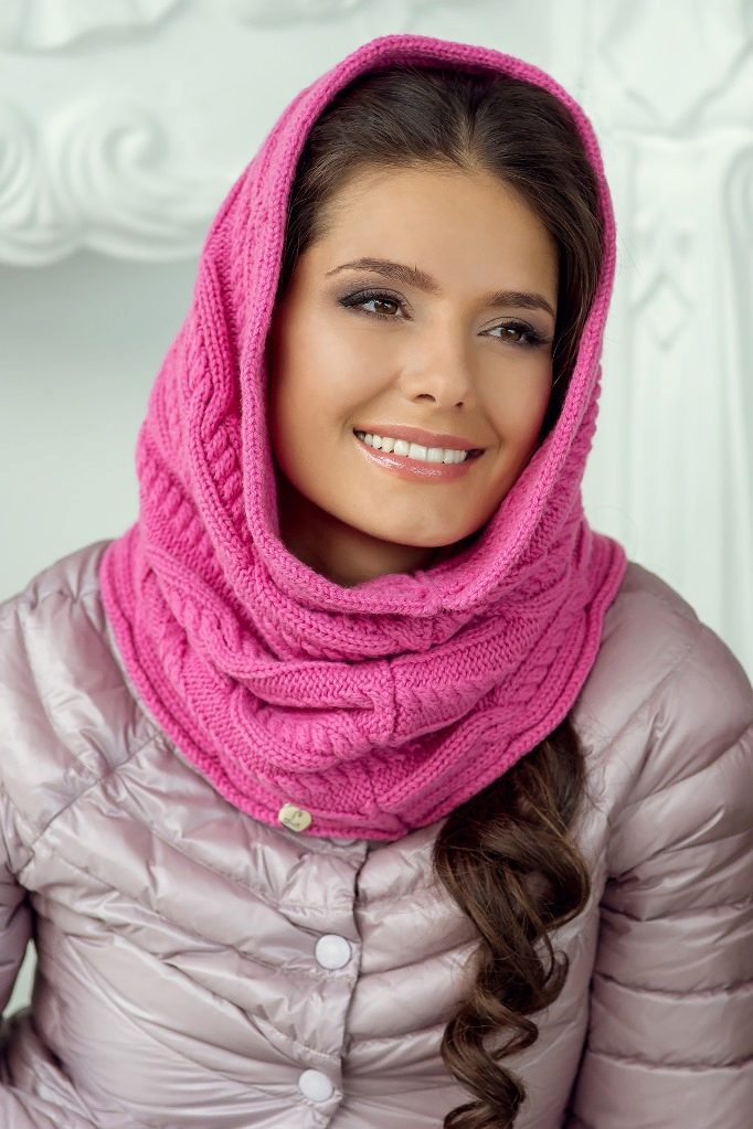 The third way is to use a scarf and cap at the same time. Throw a broadband scarf around your neck, wrap it in a figure of eight, and then dangle one of the loops over your head, straightening the scarf over your head to resemble a hood-cap. Thus you get a kind of knitted hood, and the head will be reliably protected from gusts of wind. Scarf-snud, dressed in such a way visually lengthens the face.