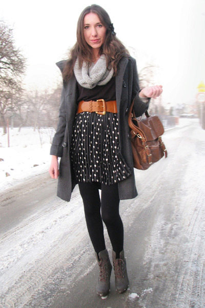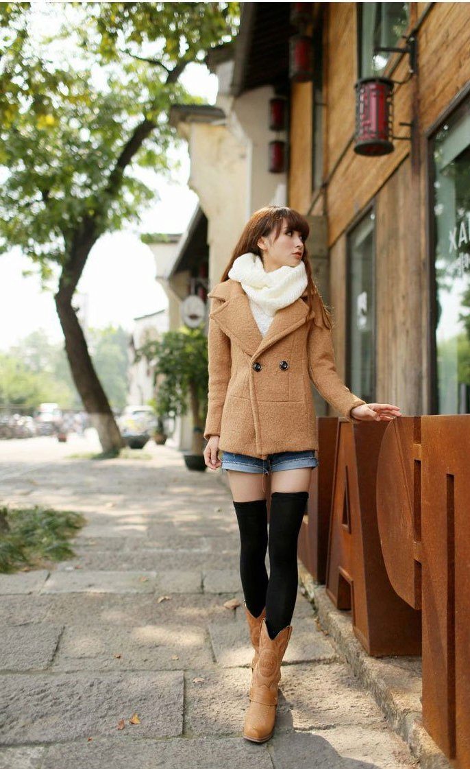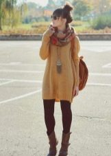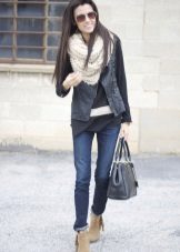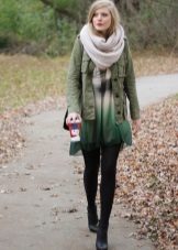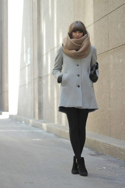 - In any outerwear, people look fuller and more voluminous. In order to divert attention from full thighs, it is recommended to wear a volume snud, tying it in a double loop way. The volume thus formed in the upper part will balance the massive lower part of the body.