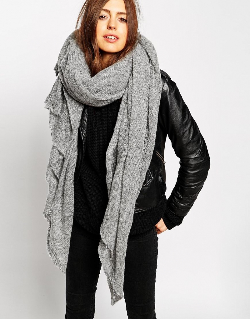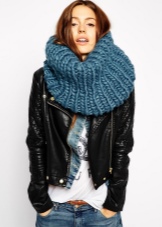 Interesting is the way of interlacing, which begins with the usual simple covering and wrapping the scarf around the neck with the ends crossed and bent forward. The resulting loop on the chest is slightly delayed and twisted into a figure eight. The loose ends are threaded into the bottom ring of the eight: one from top to bottom, the other - on the contrary, then the structure is slightly tightened. This option is in harmony with the leather jacket.