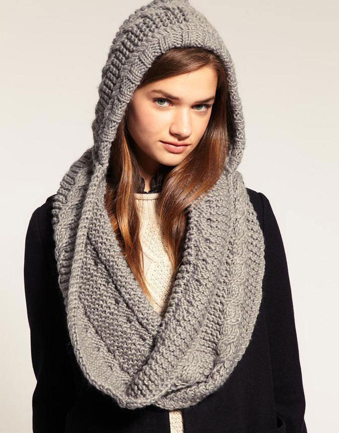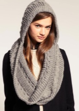 There is an endless dream in different ways. You can twist an eight out of it, put it over your shoulders, make a hood out of one ring, put it on your head and straighten the folds. The uniqueness of this model lies in the fact that it allows you to change the type and purpose of the template beyond recognition. It can be not only a combined version of a scarf and a headdress, but also a vest - a bolero, and even a poncho.