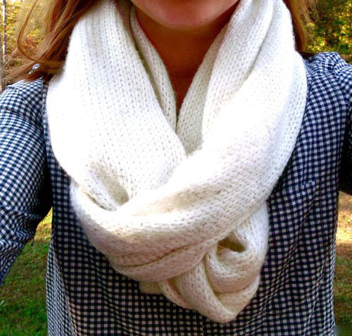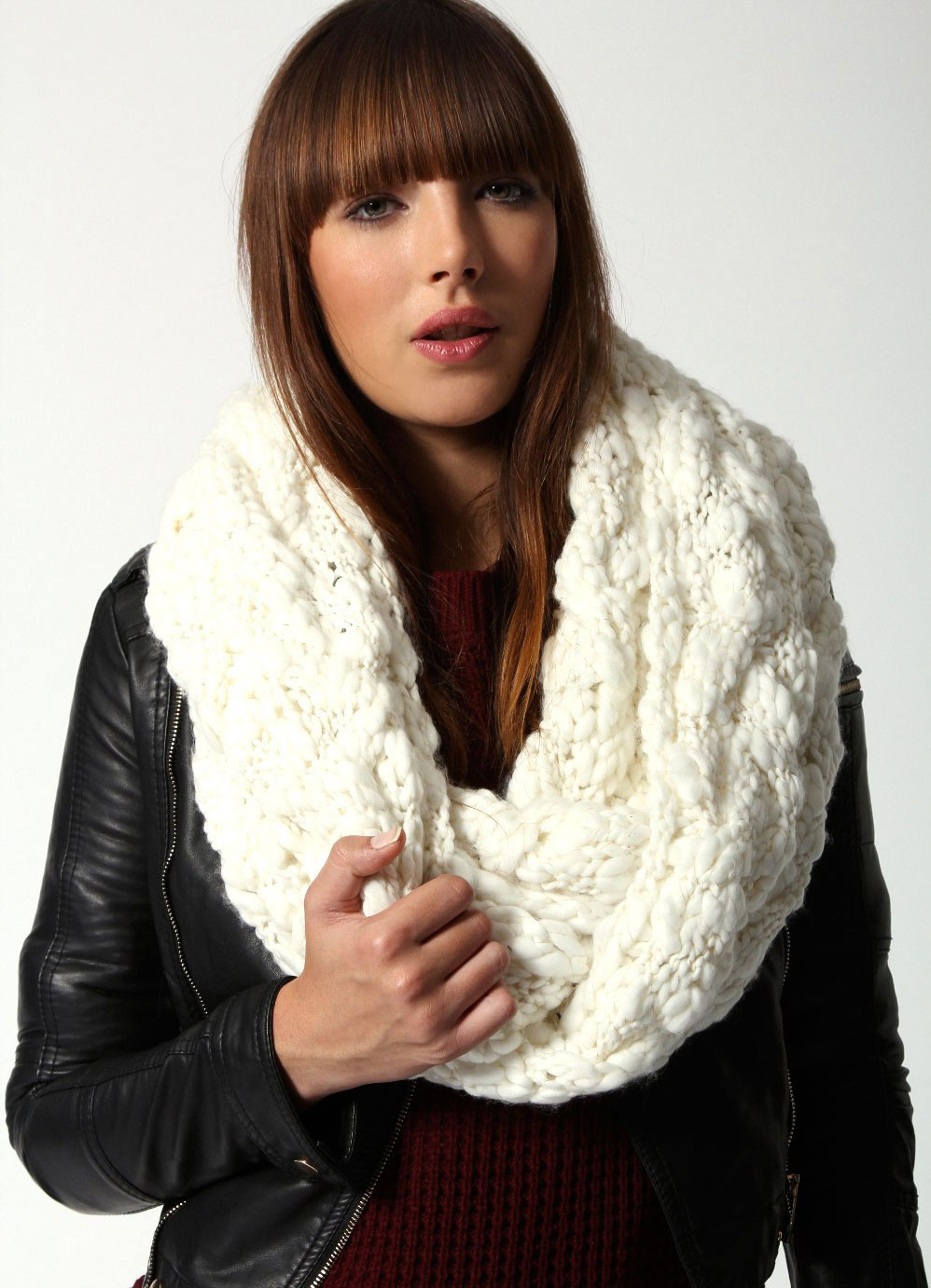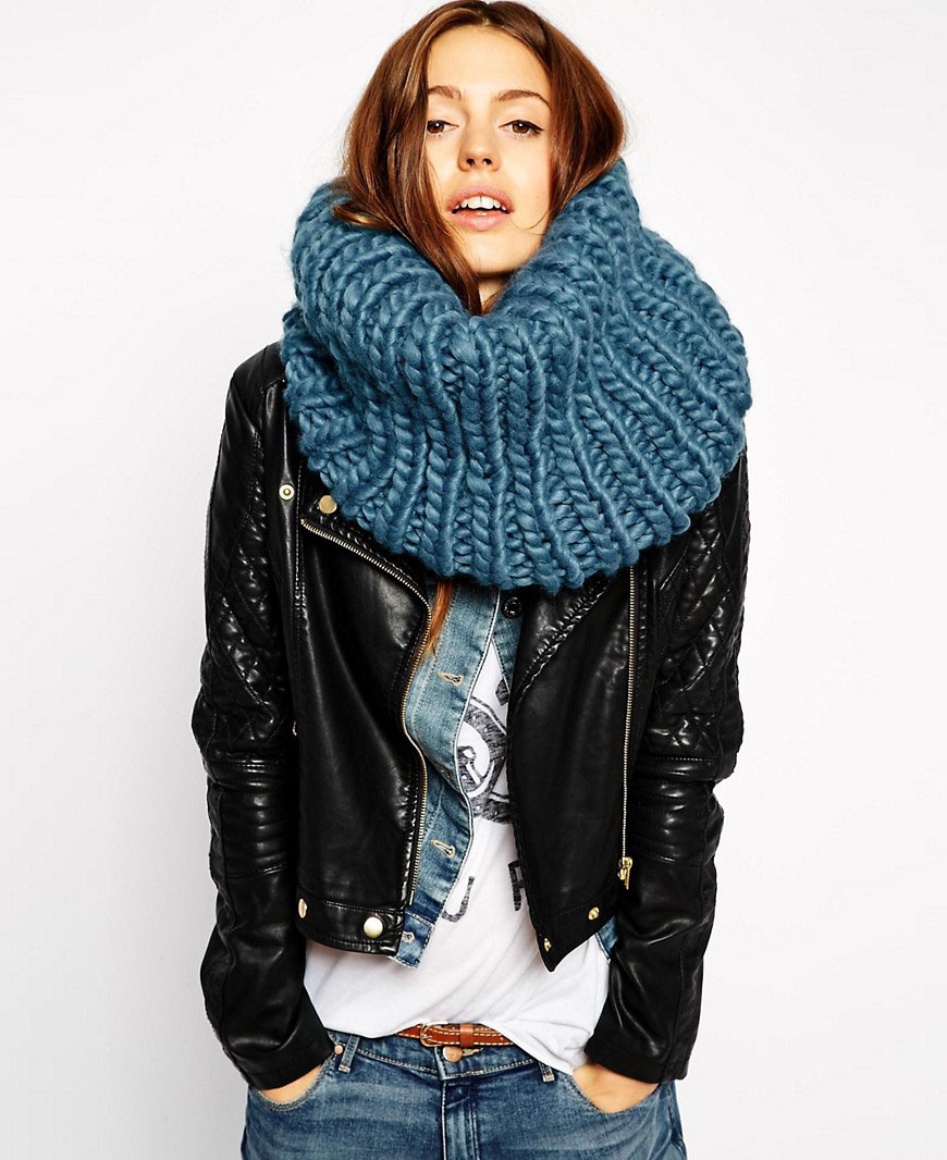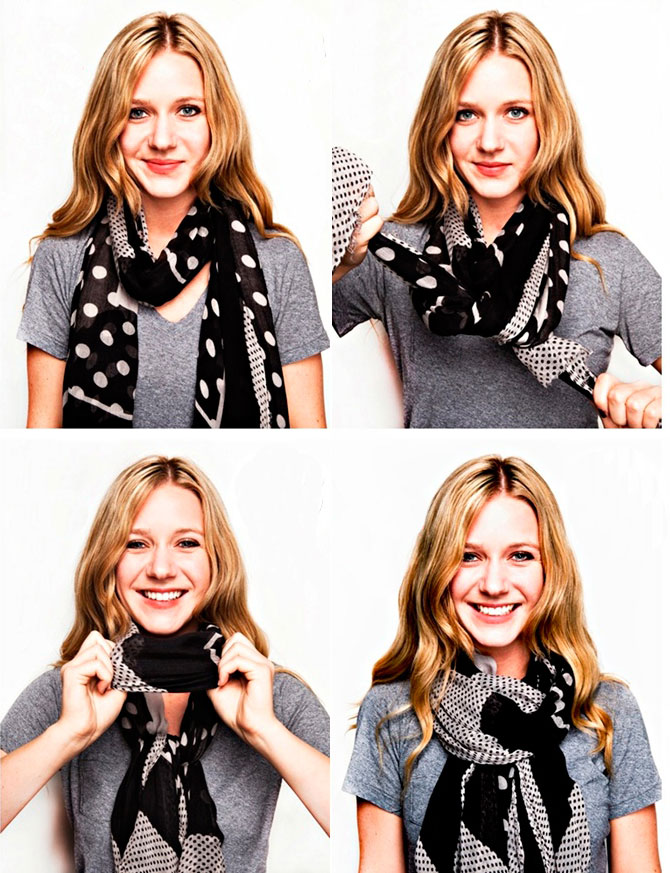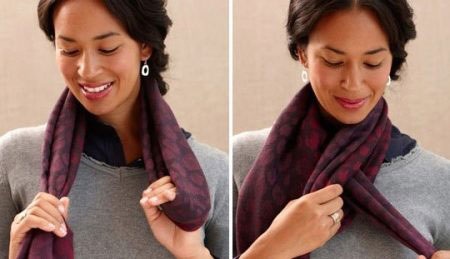 An interesting and popular way of tying an accessory is the so-called loop. For this, the product folds in half, slips over the neck, threading the loose ends into the resulting loop. It remains to tighten it a bit - and the stylish design is ready. This design is perfectly combined with a jacket, down jacket, as well as a leather jacket and coat.