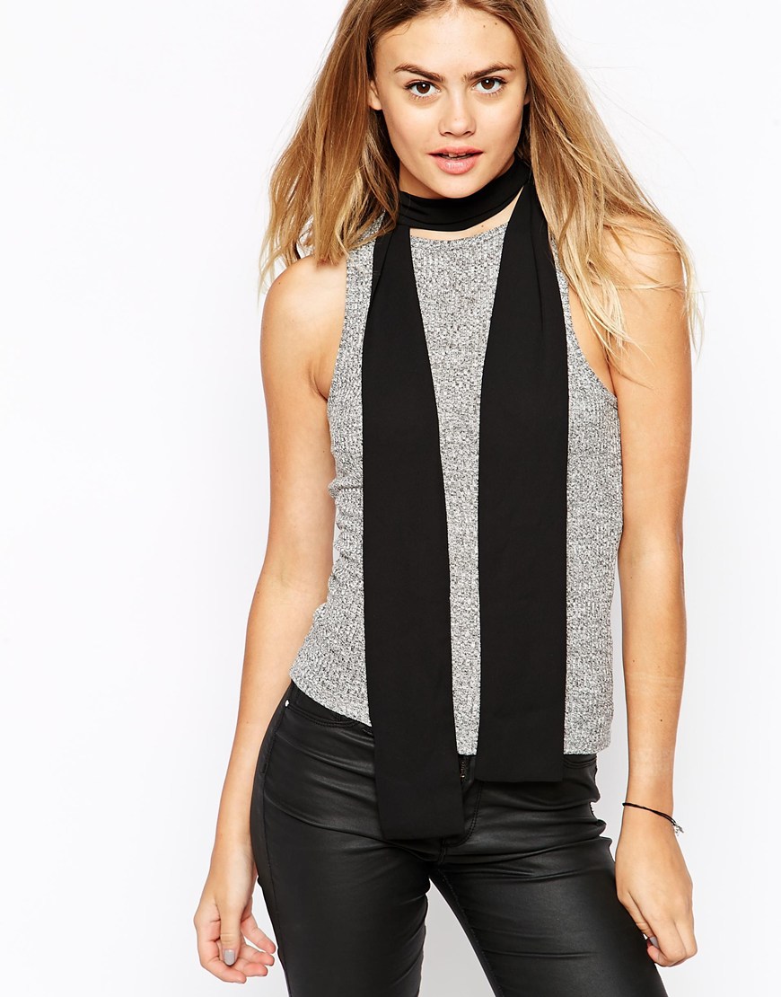 The original decoration of the costume will be a scarf-tie, in appearance resembling this accessory. This design is carried out quite simply: the product is wrapped around the neck, then the ends crossed at the back are pulled forward and tied under the accessory, covering the knot. The free knot variant is performed on the simplest basis, while the hanging ends are knotted at any place depending on preferences.