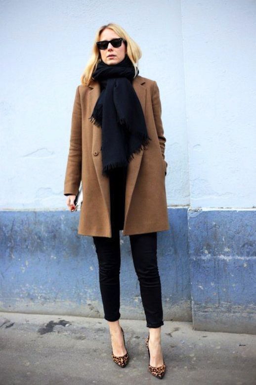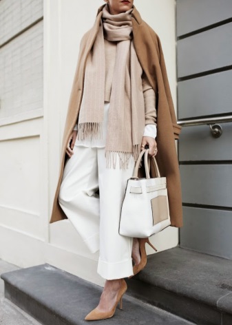 In order for your look to look stylish, you need to select all accessories (boots, bag, scarf, belt) in one tone. If you wear a black coat and a light brown scarf, shoes with heels or platform, an elegant handbag, you will get a very fashionable look.