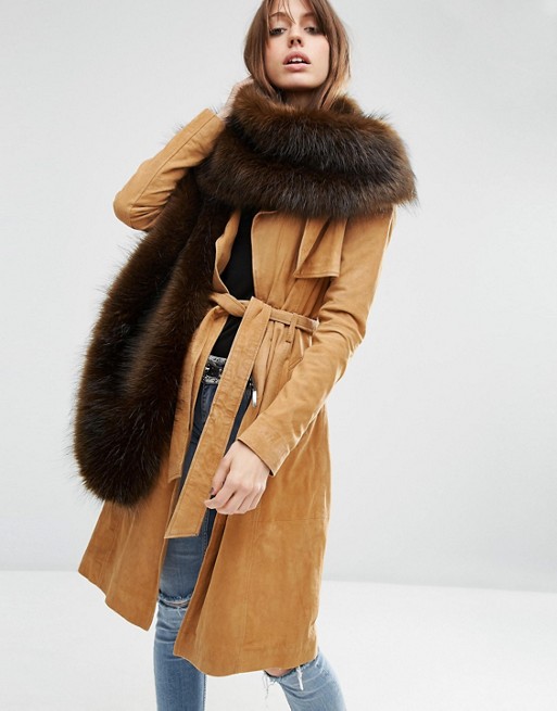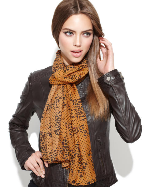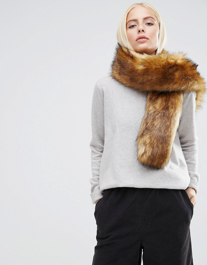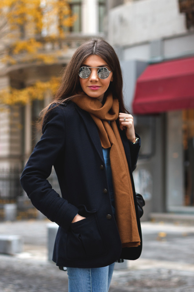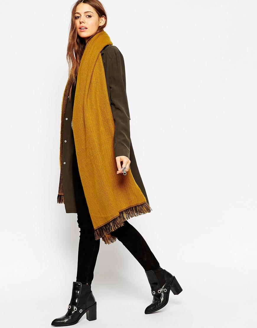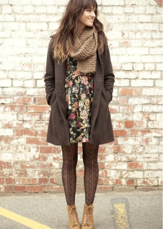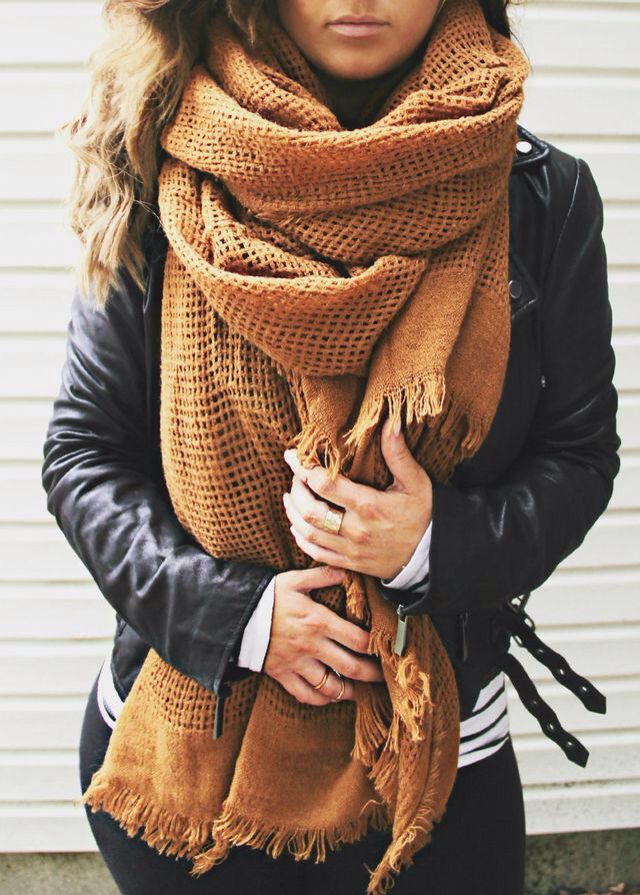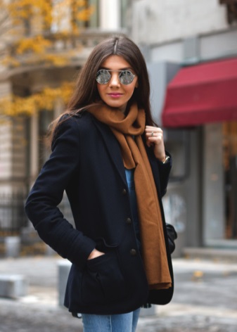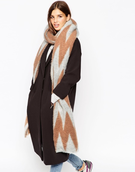 The scarf of a brown shade is perfectly combined with any kinds of outerwear. The question of what to wear with such a scarf, when it is already warm enough outside, will not take you by surprise, as there are many options. As a top, you can wear a sweater, a sweater dress or a pullover, and the bottom can be jeans, trousers, leggings, tights. If you want to highlight the wasp waist, it is enough to wear a wide belt in a single color scheme with a scarf.