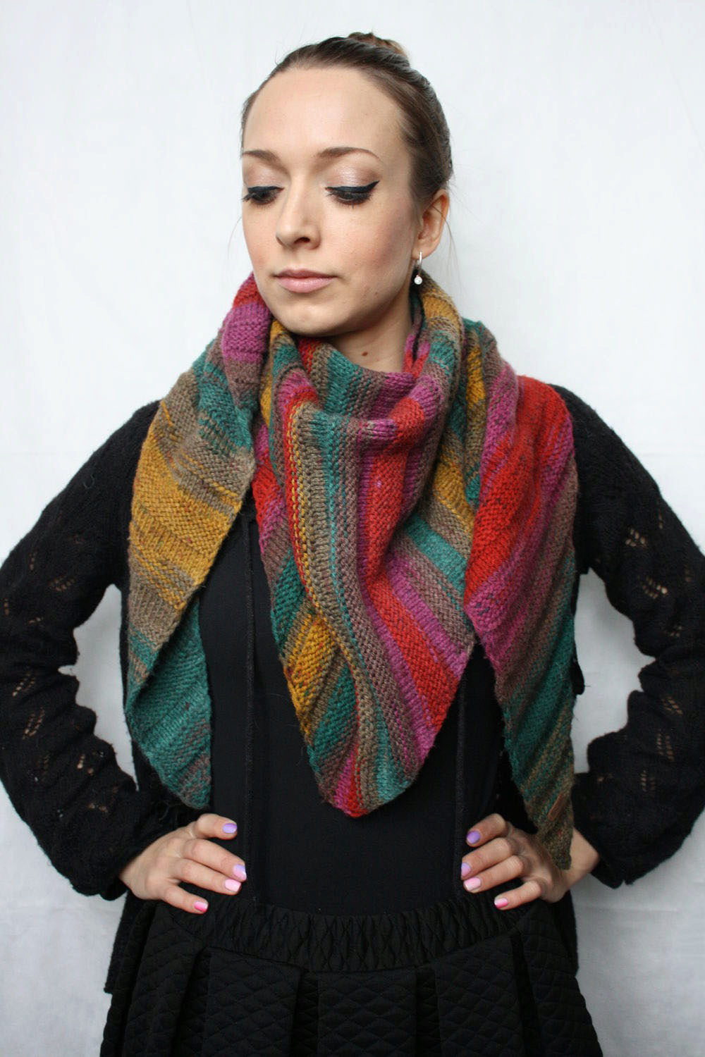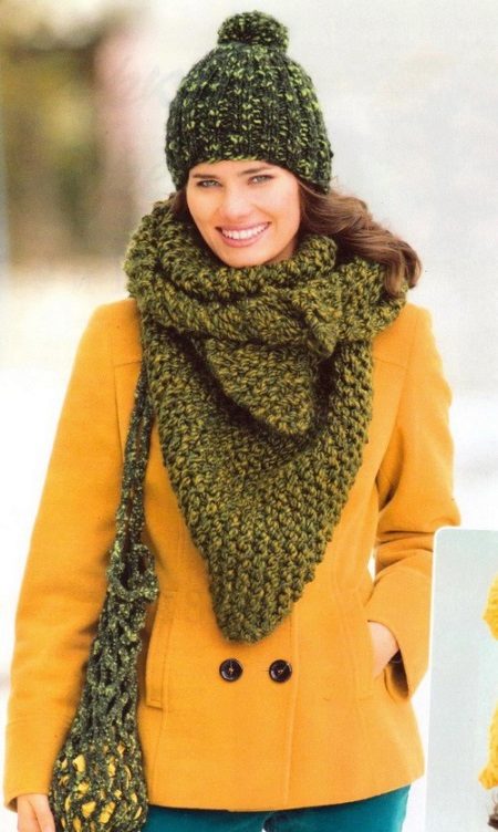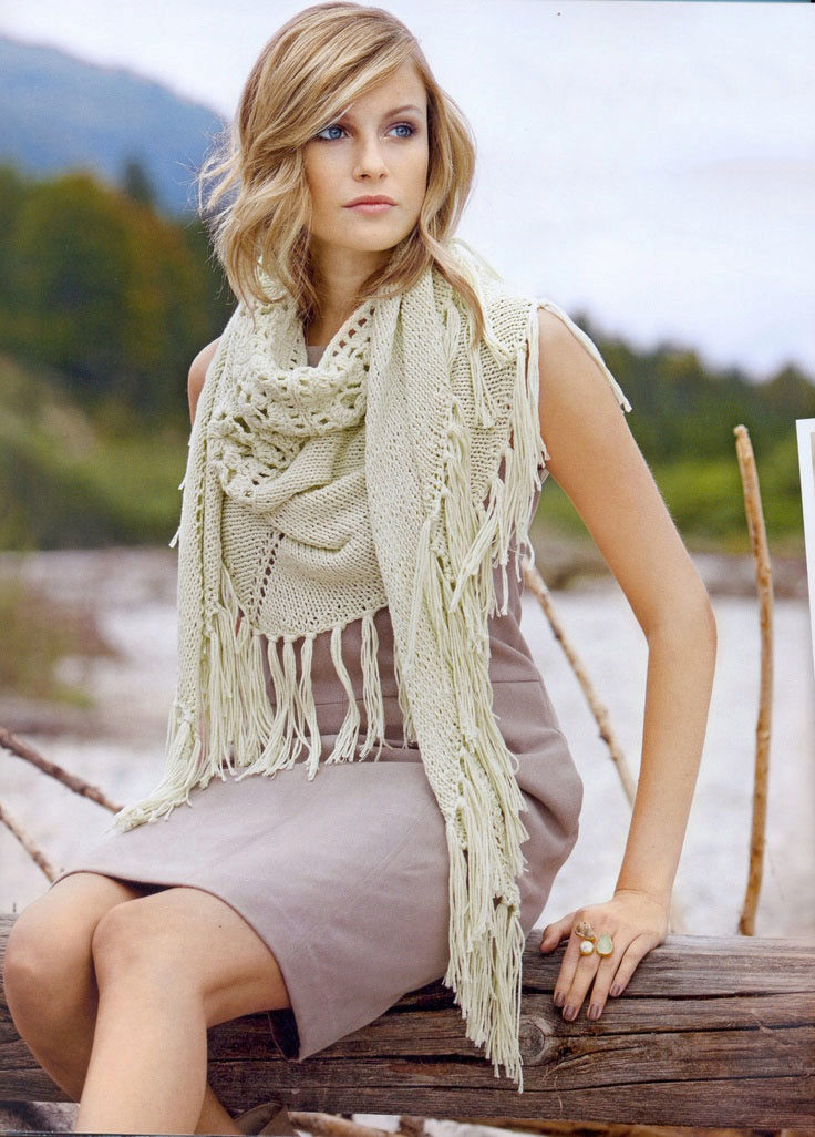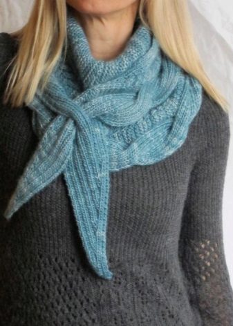 Instead of a cardigan baktus is also combined with warm sweaters or sweaters. The sizes, colors, knitting and manner of tying a scarf makes the image with a regular jacket brighter and more original.