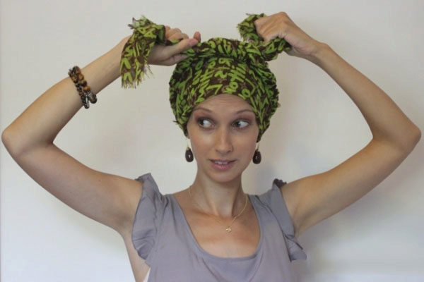 Another option to tie like a turban. You need to put it on your head, tuck it near your forehead and cross the ends to direct them around your head and tie.