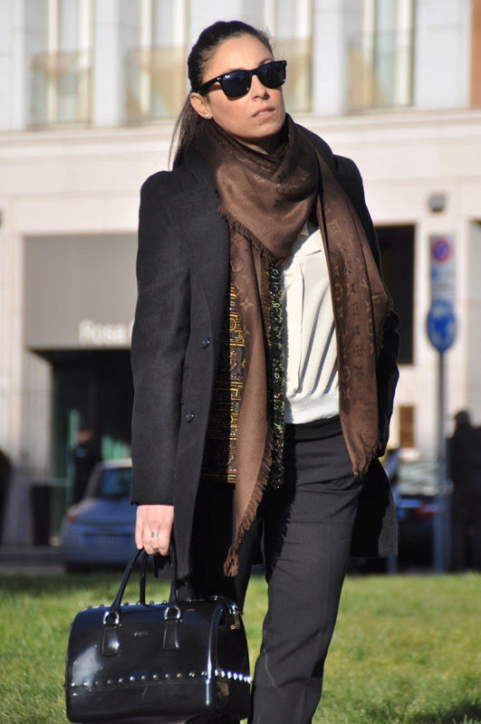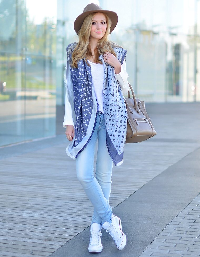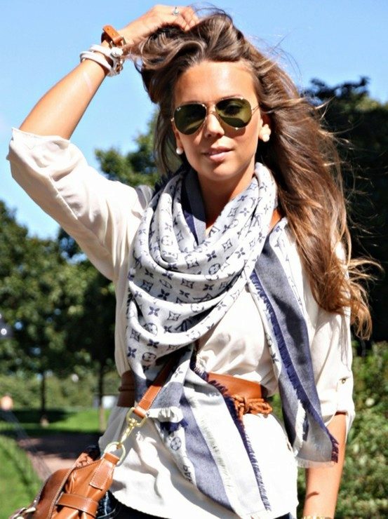 Such a wardrobe item as a Louis Vuitton scarf will be advantageously combined with any image and style. One of the best combinations, skinny jeans and a stylish jumper.