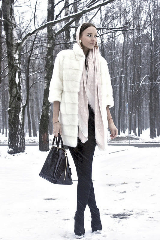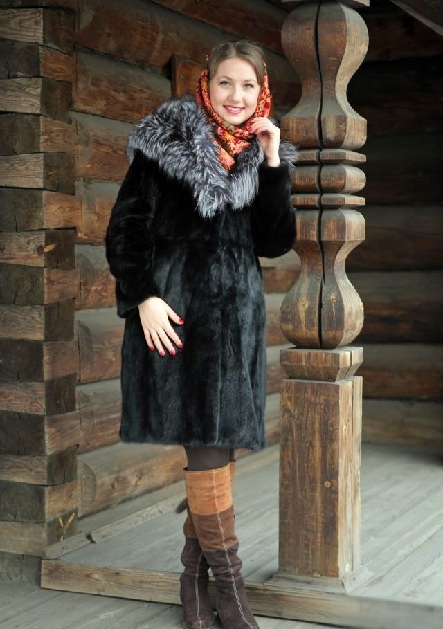 If it is rather cold outside, it is possible to elegantly tie a scarf over a mink coat. Put it under the collar, wrap it twice around the neck and fix it with a regular knot. But one should not get very involved in this method of socks, because accessories from dense and heavy material will wear down valuable fur over time, provoking ugly bald patches.