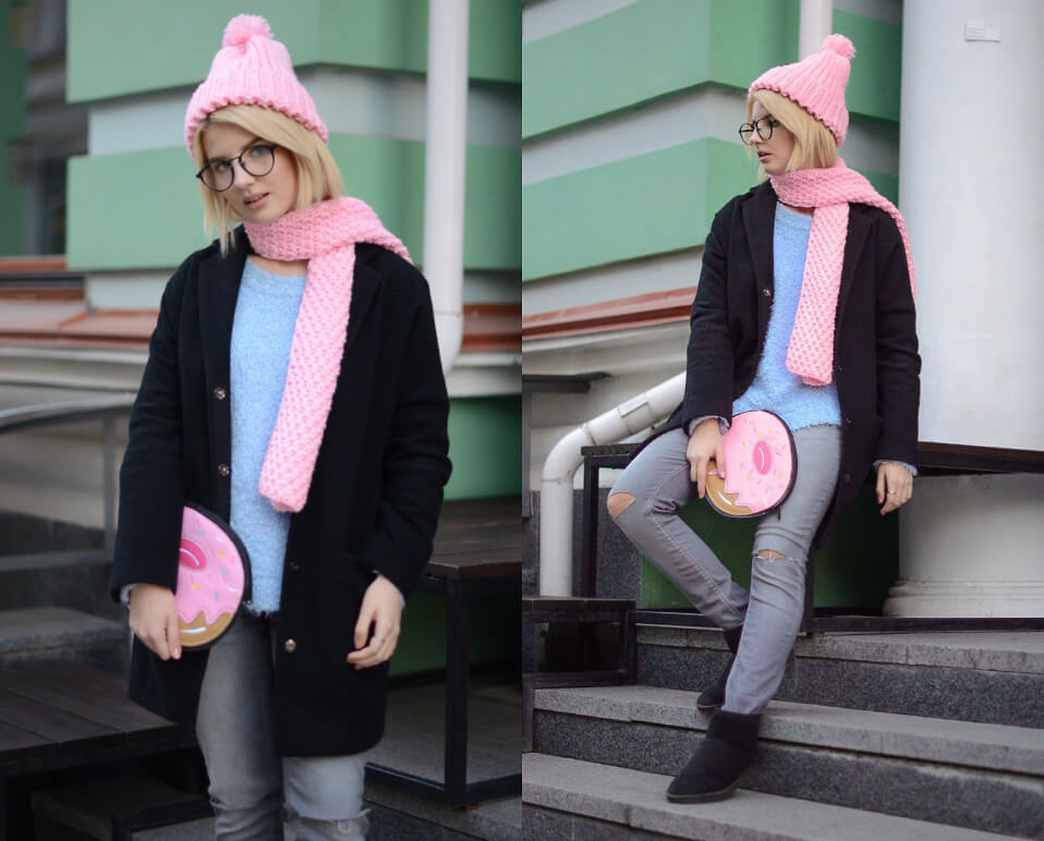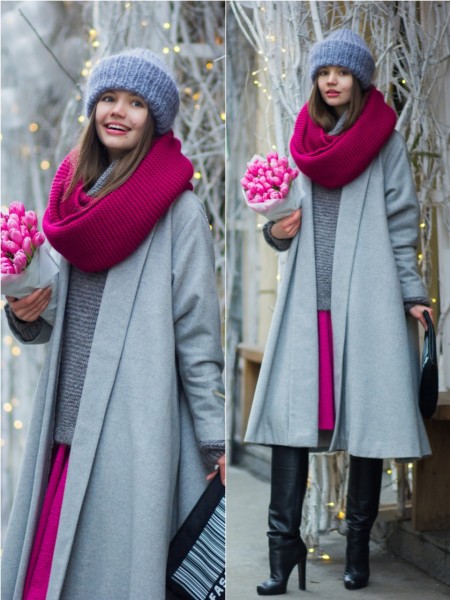 The third classic option is gray and pink. It is a mistake to think that gray is dull. Be convinced of this by wearing a knitted pink scarf to a gray coat. And if you want to add colors to the image, then let it be white or black.