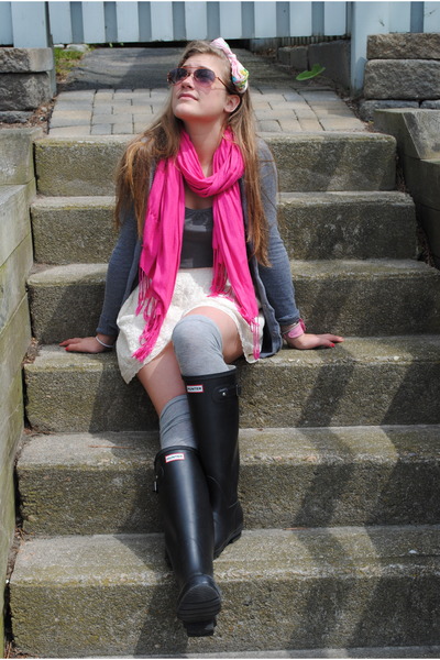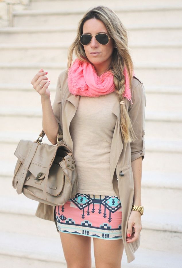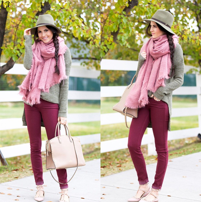 The combination of gray and pink is one of the ideal options with which to wear a pink scarf. In order to properly combine the image, you must remember that the same pink color is suitable for a calm gray color. And, on the contrary, to bright gray and rich colors it is necessary to choose the same scarf. It can be bright fuchsia or deep crimson hue.