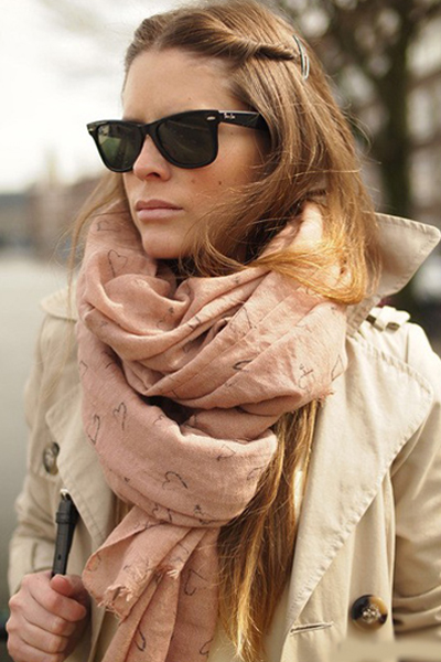 The scarf from this color category will go well with the classic black or white. This scarf you can both dilute the image and correctly place accents.
