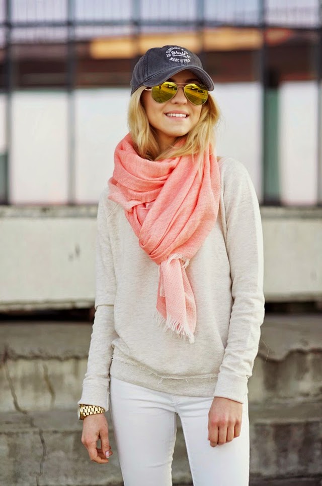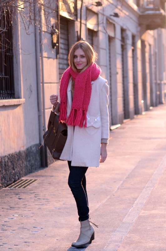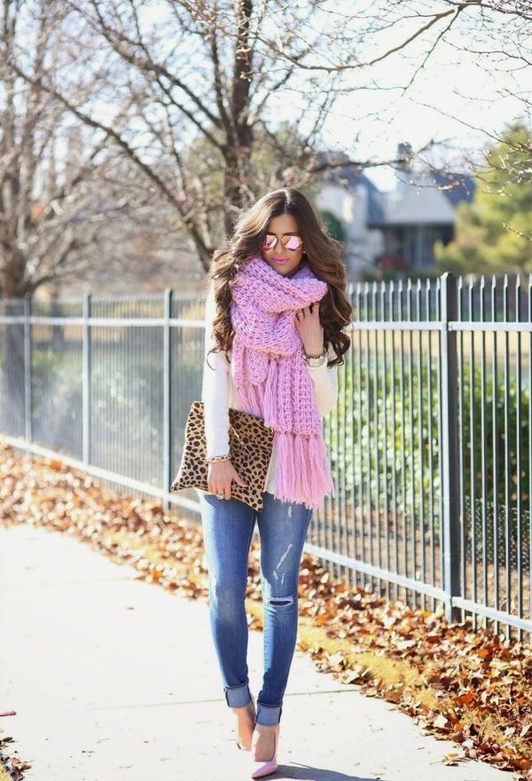 Pink scarf fits to absolutely any style. The main thing to take into account the season, texture and shades of the image as a whole. With a properly chosen shade, model and style decision, a pink scarf will be the perfect companion for city walks or a meeting in the office.