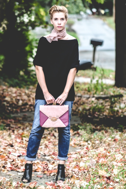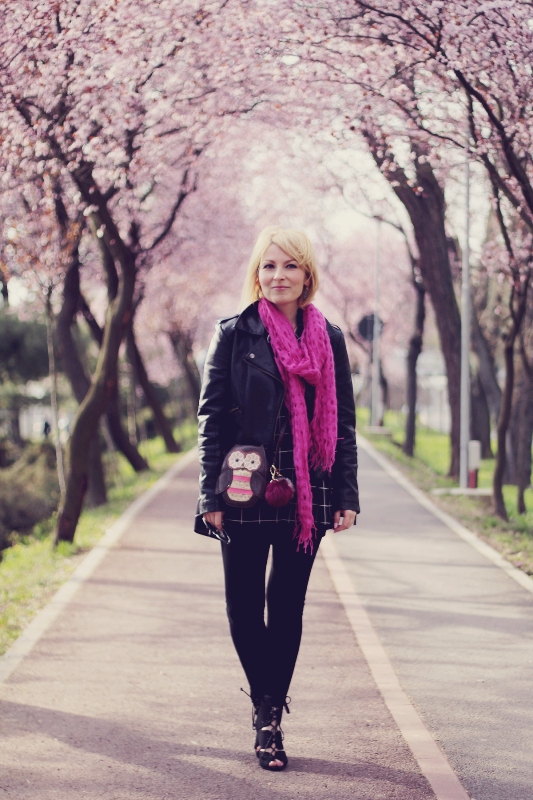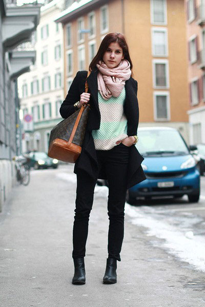 If you are a black lover, and he prevails in the image, then the pink scarf will dilute the gloom and monotony. Many stylists recommend pink accents in combination with black things.