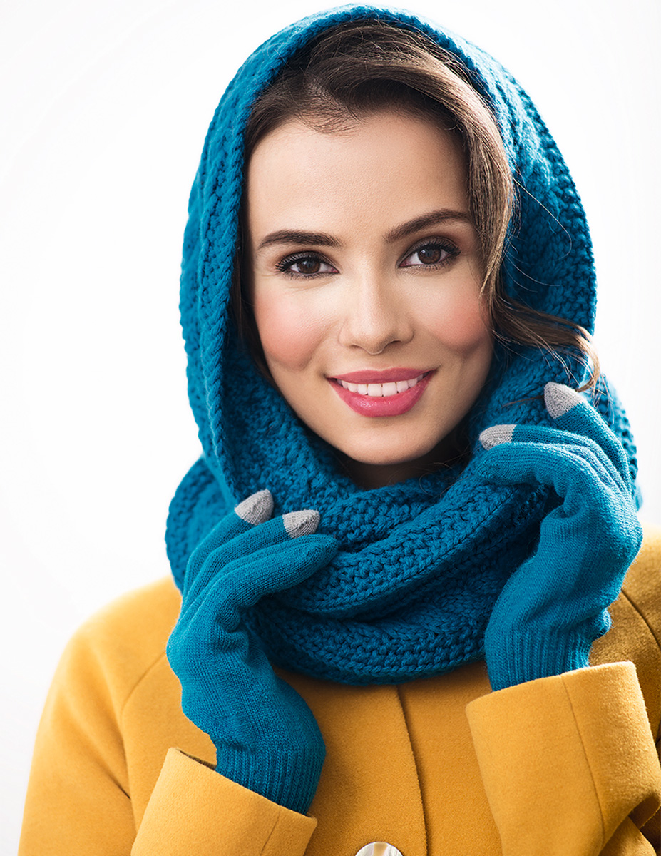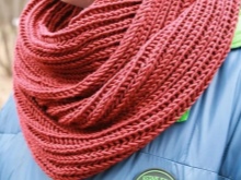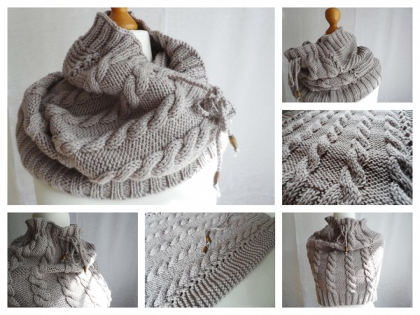 Scarves with a large diameter rings are worn in two turns around the neck, and if the width permits, they peck on the head like a kind of hood.