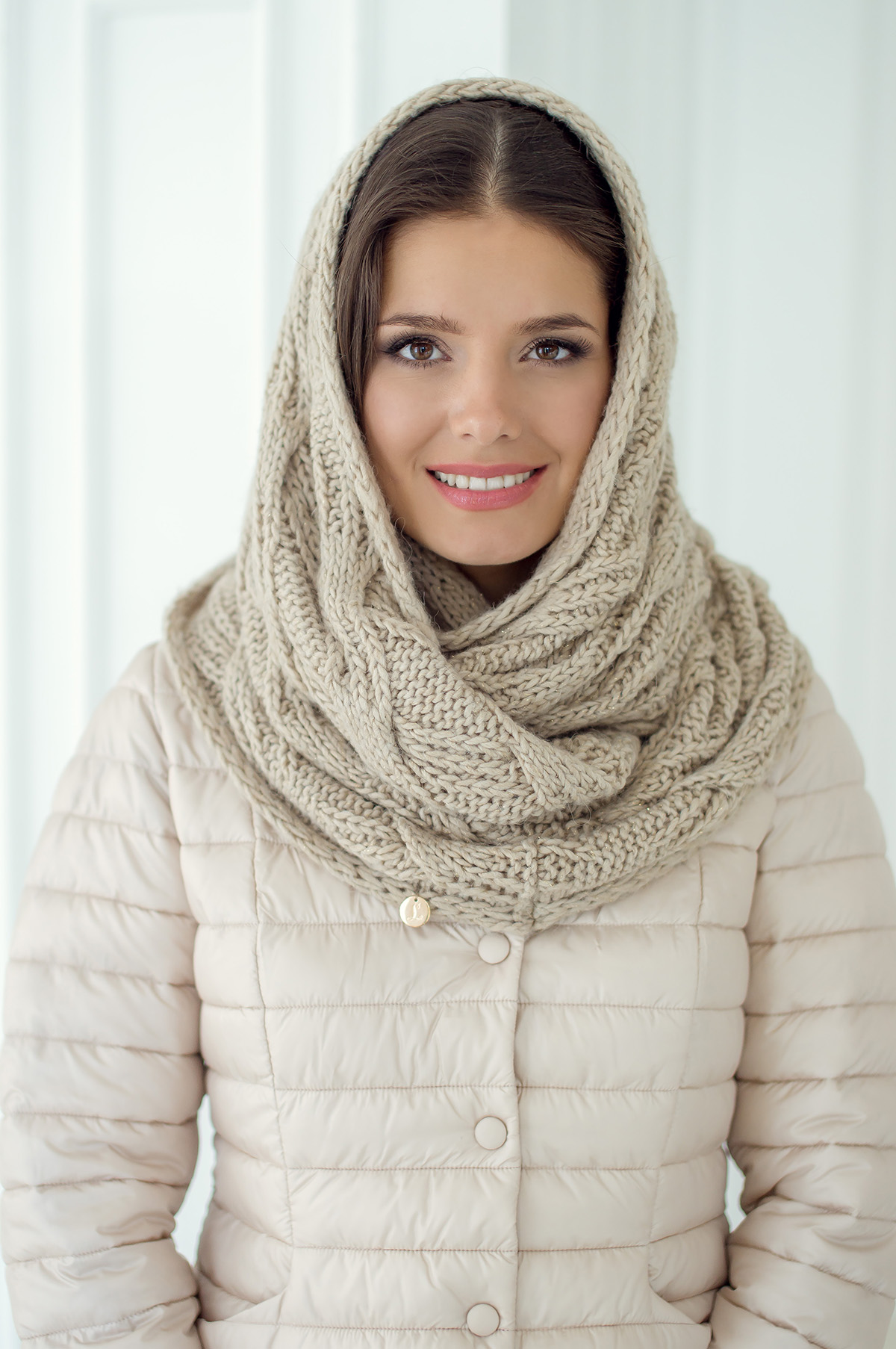 - scarf hoodThis model is similar to a scarf-LIC and a scarf-hood, but the top edge of such a scarf is usually fixed under the chin with the help of ties. Such a scarf can completely replace the cap. Often, all of these names (snud, scarf-trumpet, scarf-hood, scarf-hood) are listed as synonyms in the name of one thing;