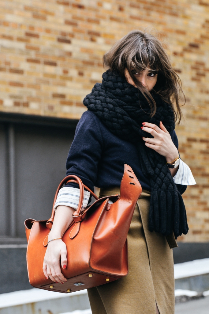 The volumetric scarf with braids is always a noticeable and bright detail of a fashionable image.