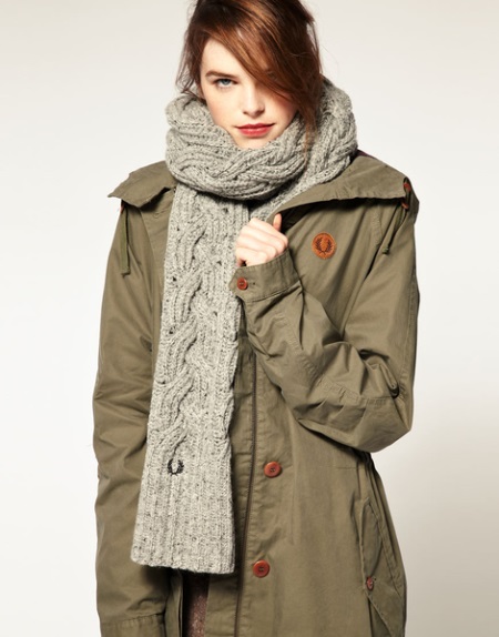 The volumetric scarf with braids is one of the components of casual style, here it looks familiar and natural. A spectacular image can be created by combining this thing with military-style clothing, for example, with a khaki raincoat. Bulk knitted scarves, clips are appropriate in sports style.