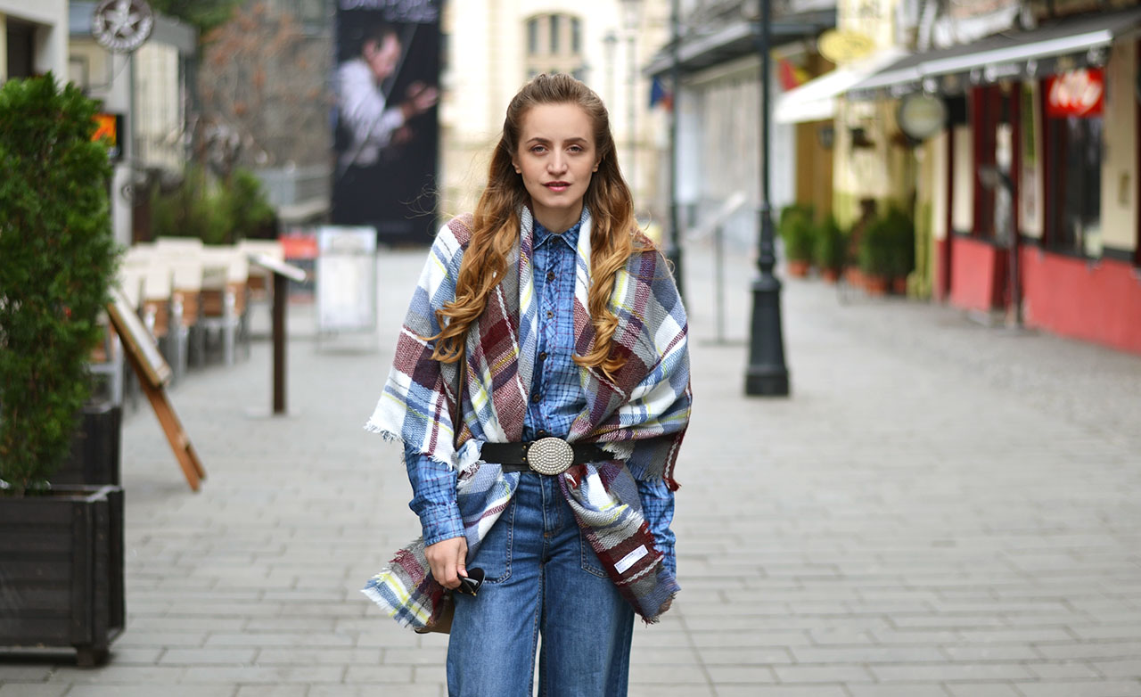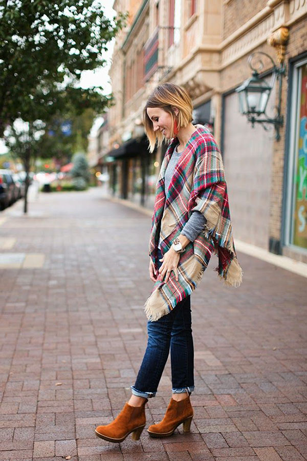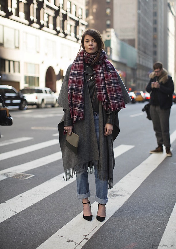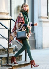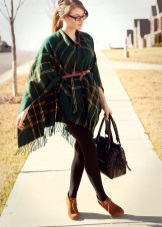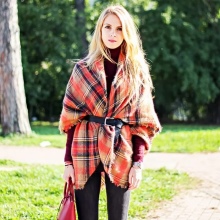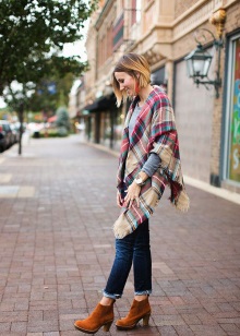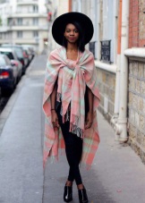 Variations of the accessory design allow you to make from it such an original project as a poncho. The plaid leaps on his shoulders and straightens, turning into outerwear. The trend model is fixed by a belt at the waist and looks spectacular with tight-fitting trousers and a sweatshirt. With a large width of the blanket, it can be folded in half, wound around the neck and secure with a large pin.