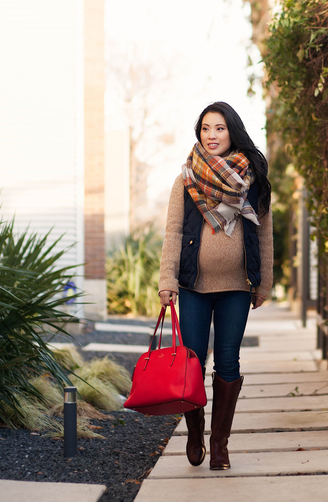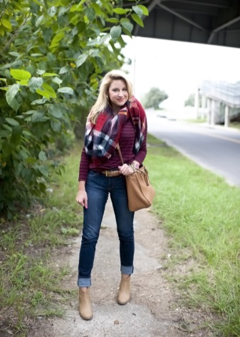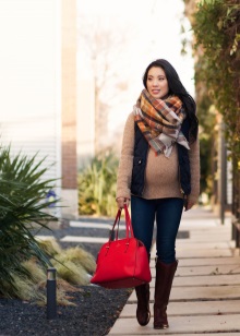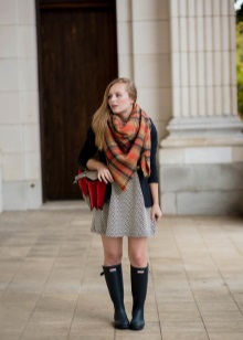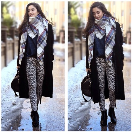 The simplest classical method involves folding the plaid in the shape of a triangle, which is angled over the chest. Free corners are crossed from behind and displayed forward to the corner of the triangle. This option is considered the traditional design of the plaid. He comes to the ensemble of a fitted silhouette, sweater, jacket or fitted dress, leggings.