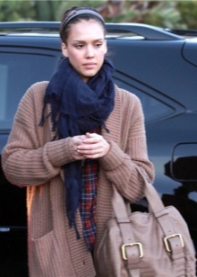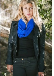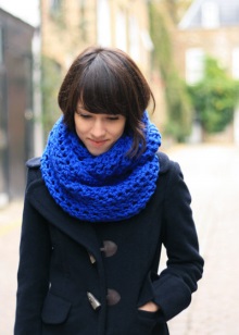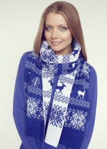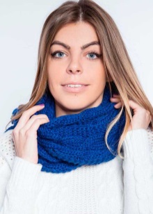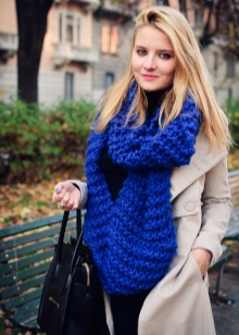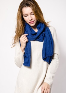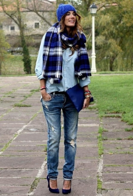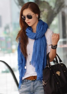 - The texture of the blue scarf and other elements of the wardrobe may be different. A massive knitted scarf enters into a perfect symbiosis with knitted t-shirts and light shirts.