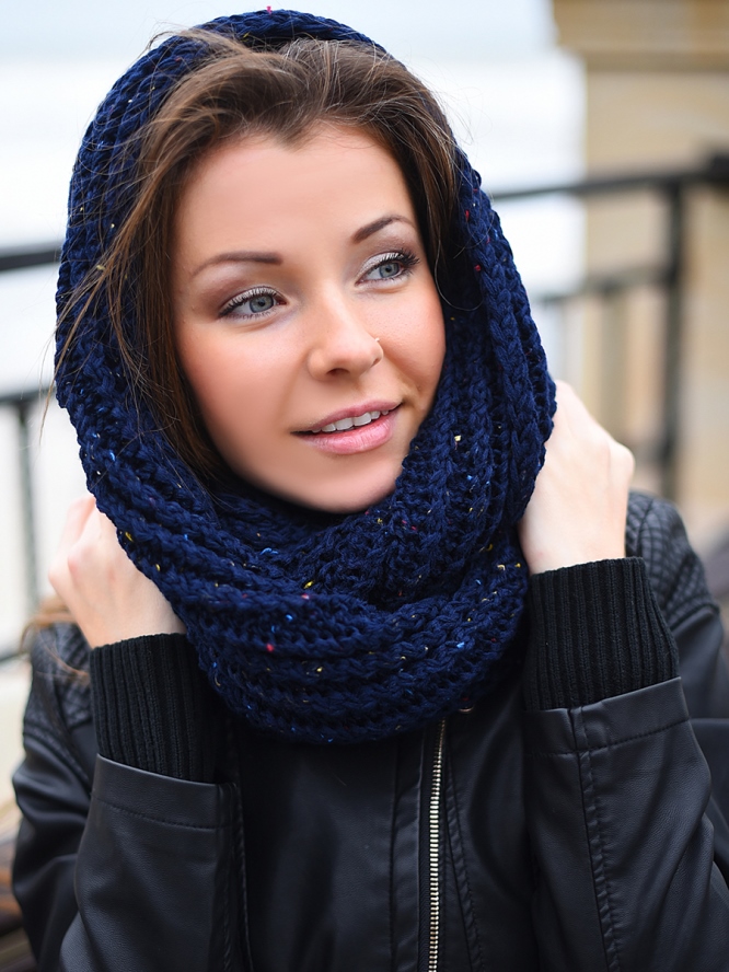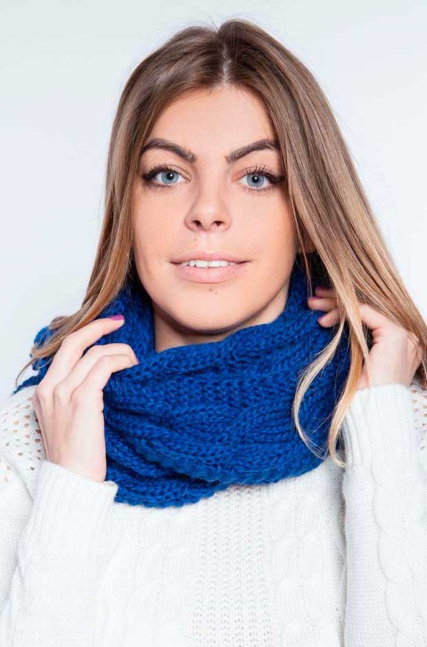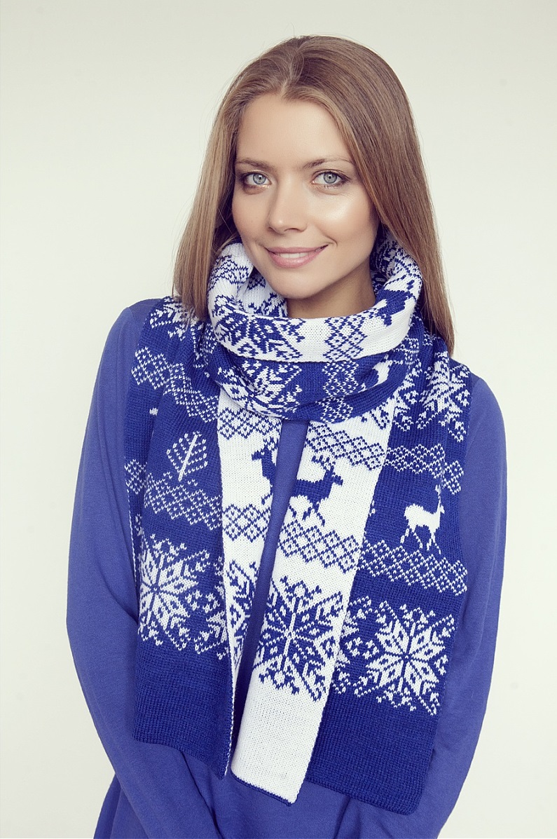 Warm scarves provide beauty and give comfort away from home. Against the background of a snow-covered city, a blue scarf will create an interesting contrast that draws attention to the woman of fashion.