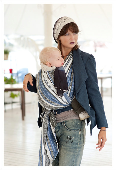 Short scarf (an average of 270 cm) is worn only in a certain way, through one shoulder. Despite the limited number of windings, the sling-scarf has several undeniable advantages: