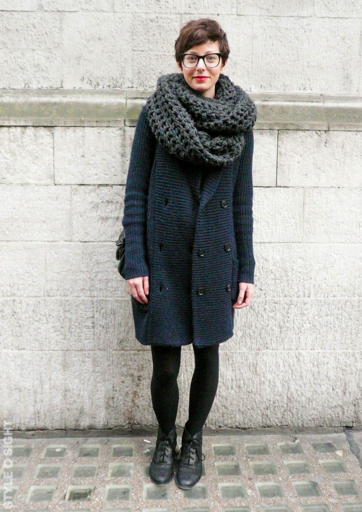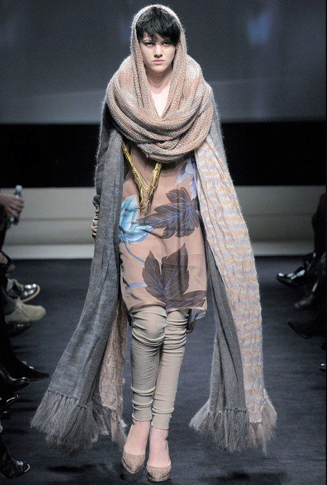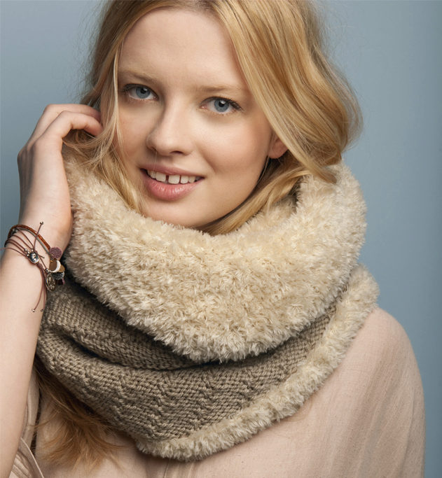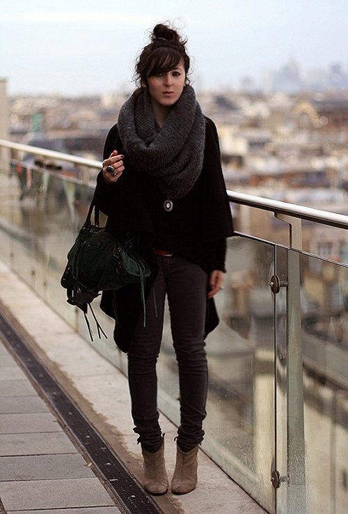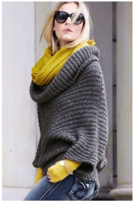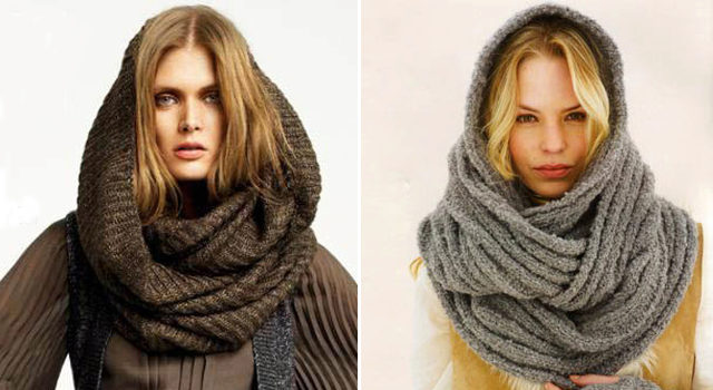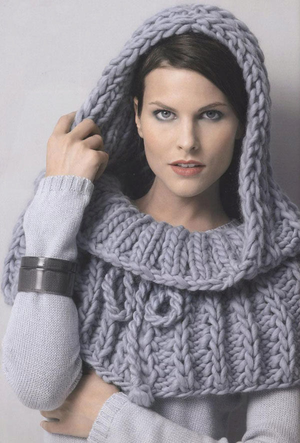 The third image is a great winter version of wearing a yoke. The warm draped scarf of large knitting can be worn on the head or wound once again around the girl’s neck, if desired. It goes well with a warm coat of similar large-knit gray.