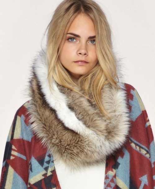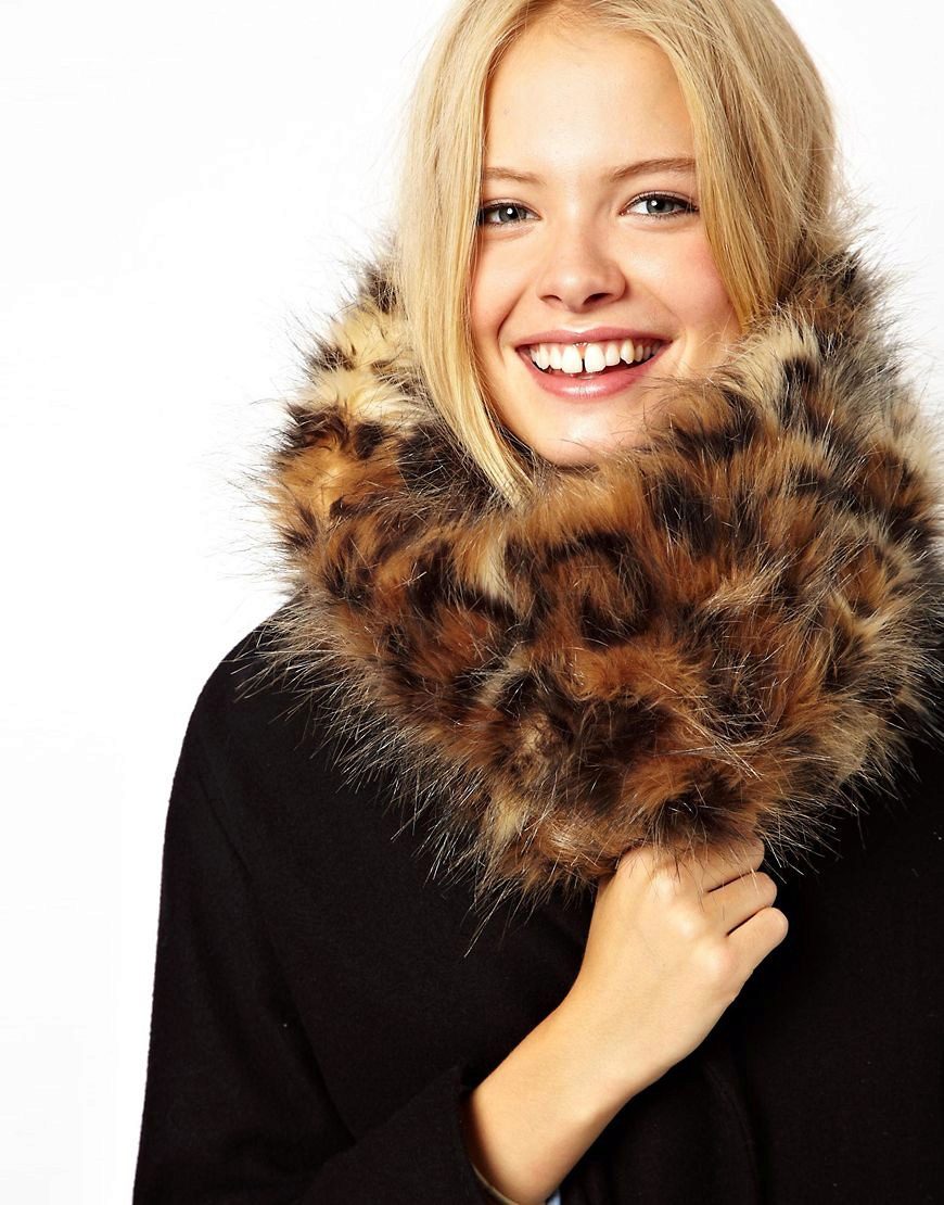 - A scarf-eight with fur is allowed to wear as a shawl, if it is long enough. This option is quite suitable for a festive event, when a girl wants to cover her bare shoulders with a dress. It is proposed to throw a loop on the neck and gently lower it down without deforming the material. Sometimes it is difficult to beautifully lay the clamp, so you can use the help of a satellite.